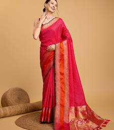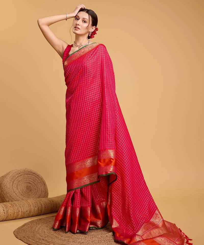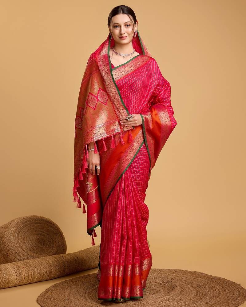 Dark pink woven checkered pure silk banarasi saree with blouse
