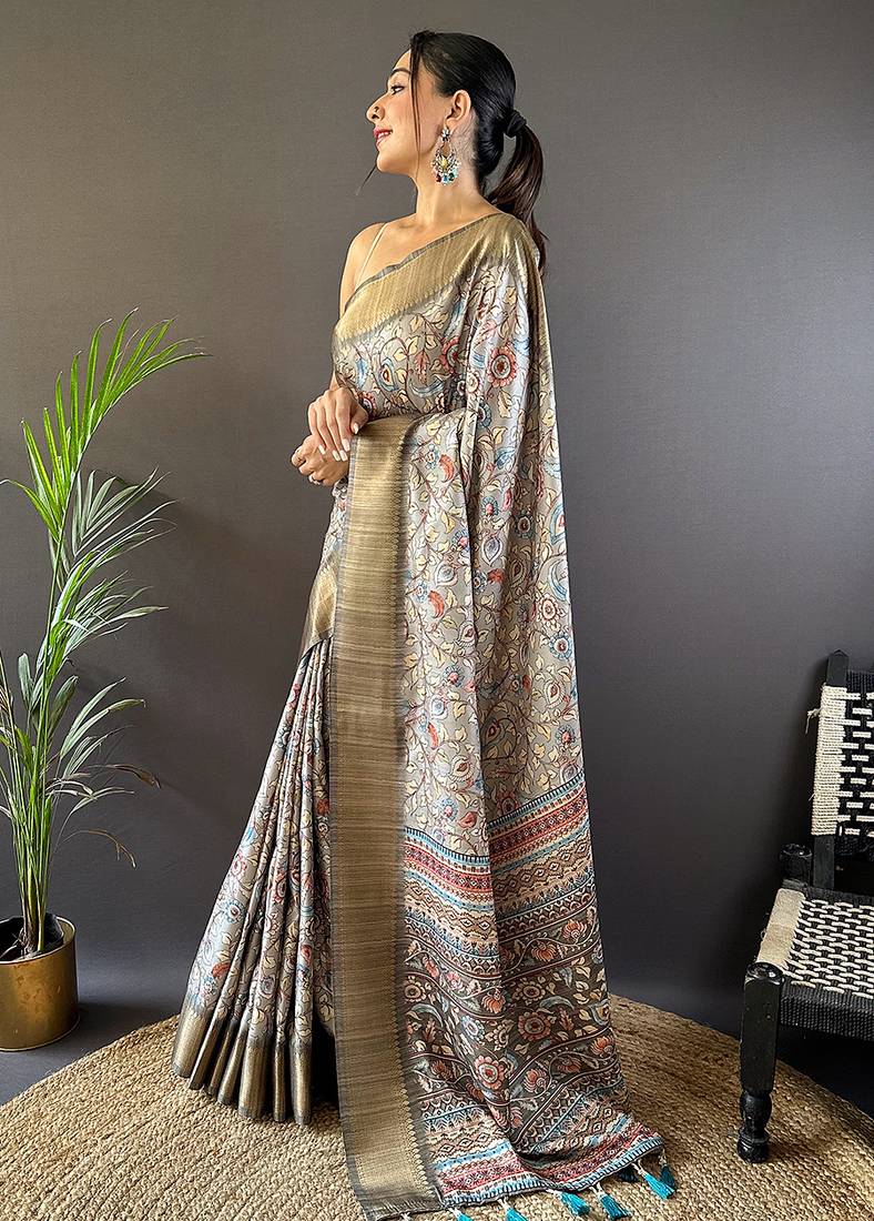 | Product Description | Soft Assam Silk Sarees With Kalamkari Prints All Over The Body Having Zari Woven Border On Both Sides Rich Kalamkari Digitally Printed Pallu. Paired With Printed Blouse. |