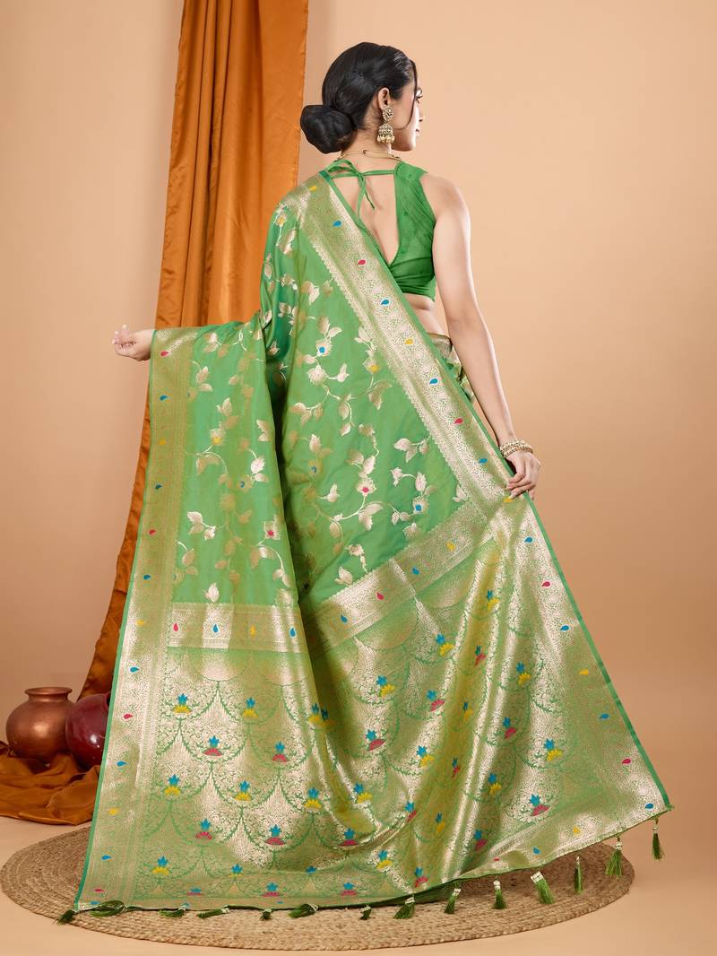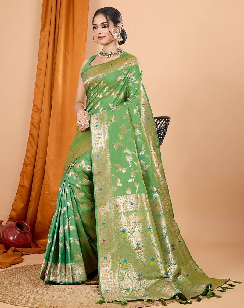 | Product Description | Soft Banarasi Silk Saree With Zari Weaving Meenakari Touchup Design All Over The Saree & Meenakari Weawing Rich Pallu With Meenakari Weawing Border & Tassels Attached At Pallu End. Blouse Running Butti Weaving Blouse |
