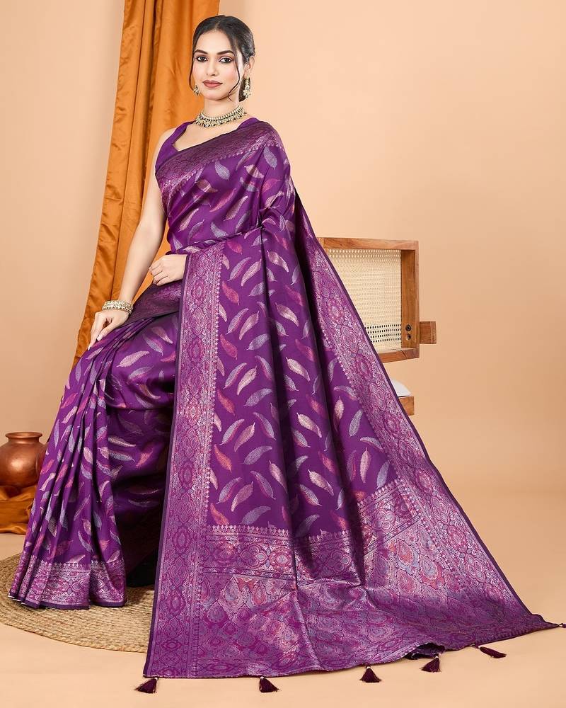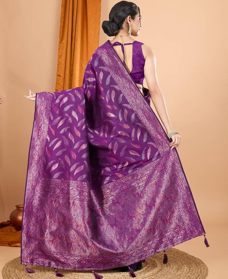 Magenta woven self design embellished pure silk banarasi saree with blouse