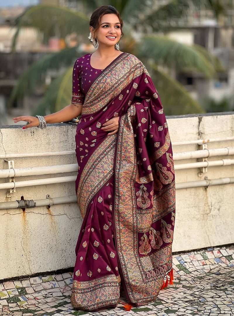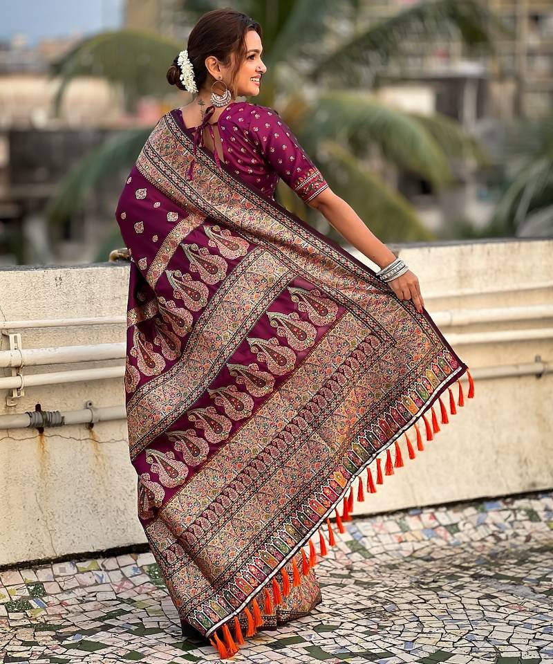 | Product Description | Pashmina Kashmiri Sarees With Meenakari Kashmiri Weaves All Over The Body , Paired With Rich Woven Meenakari Border, Rich Woven Meenakari Pallu With Tassels. |