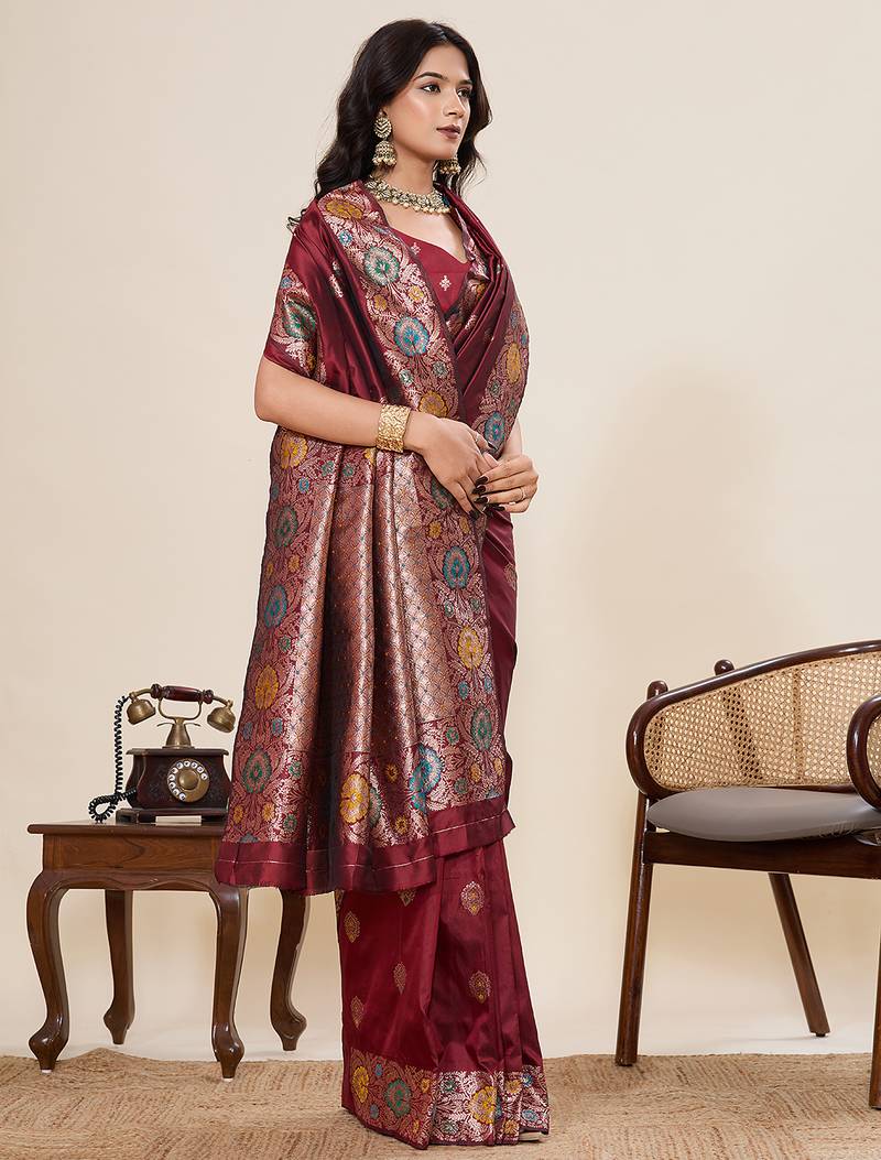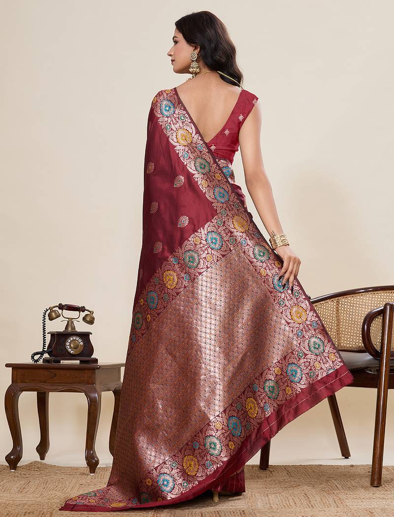 Maroon floral print woven pure jacquard banarasi saree with blouse