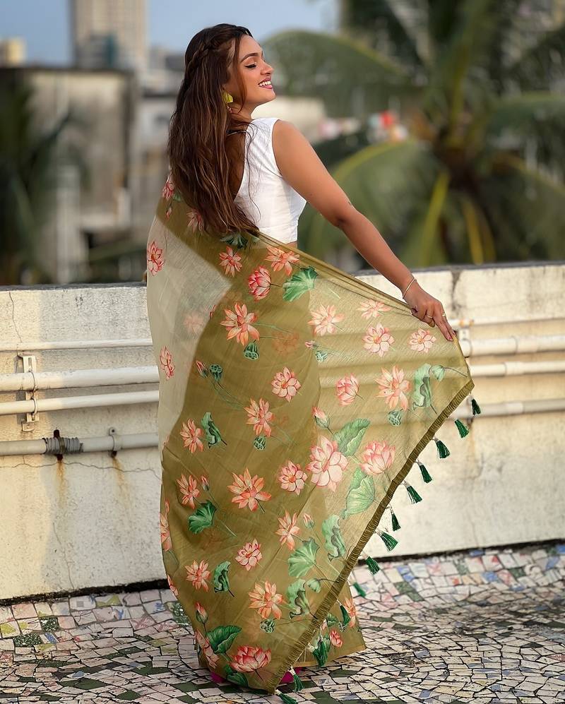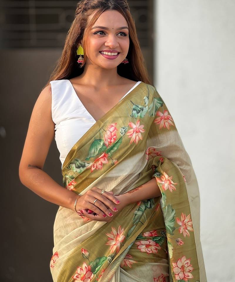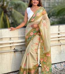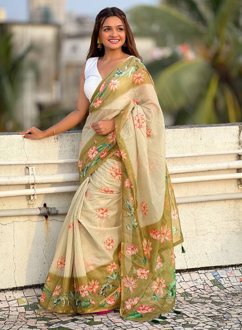 Mehendi printed chanderi cotton printed saree with blouse