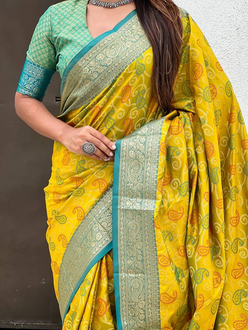 | Product Description | Patola Silk Sarees With Meenakari Bandhani Weaves All Over The Body Having Contrast Rich Zari Woven Pallu And Paired With Silk Contrast Blouse |
