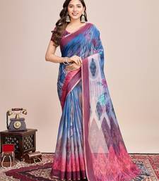 Multicolor printed floral print geometric print cotton linen bollywood saree with blouse