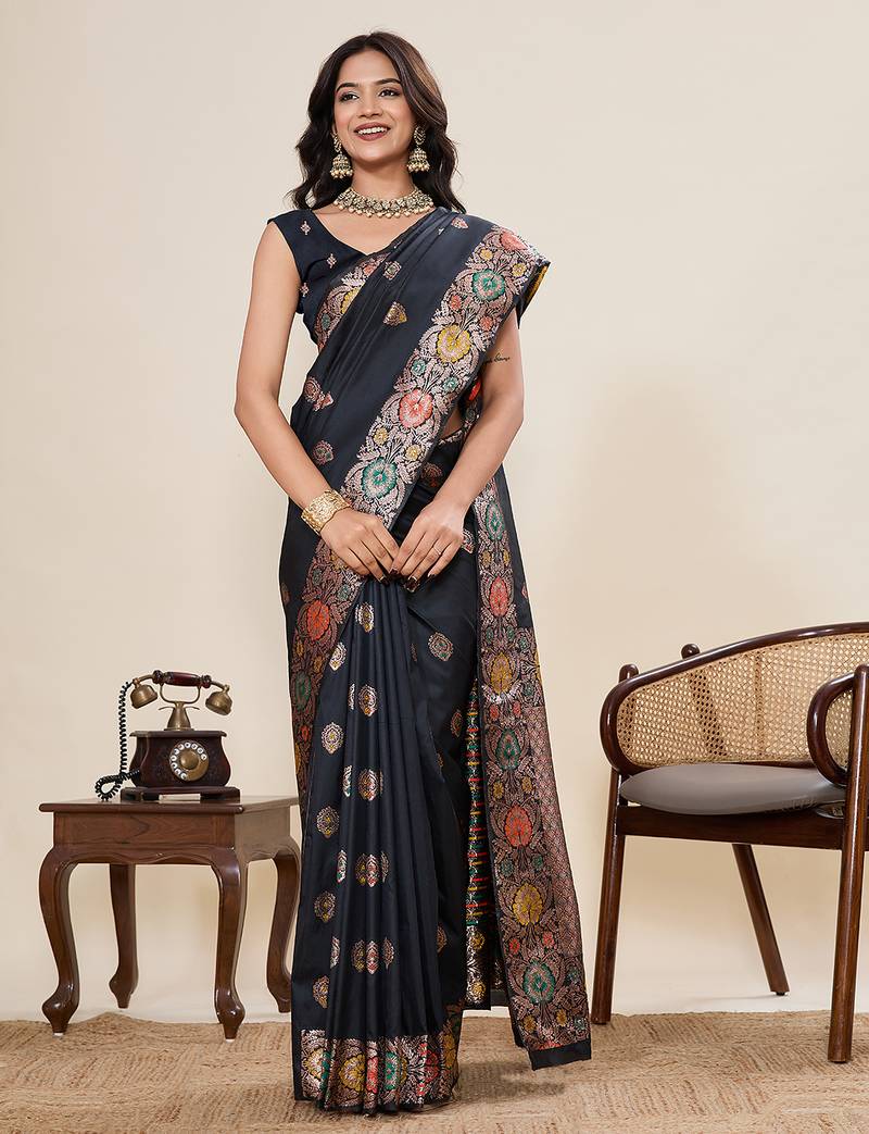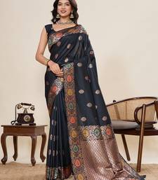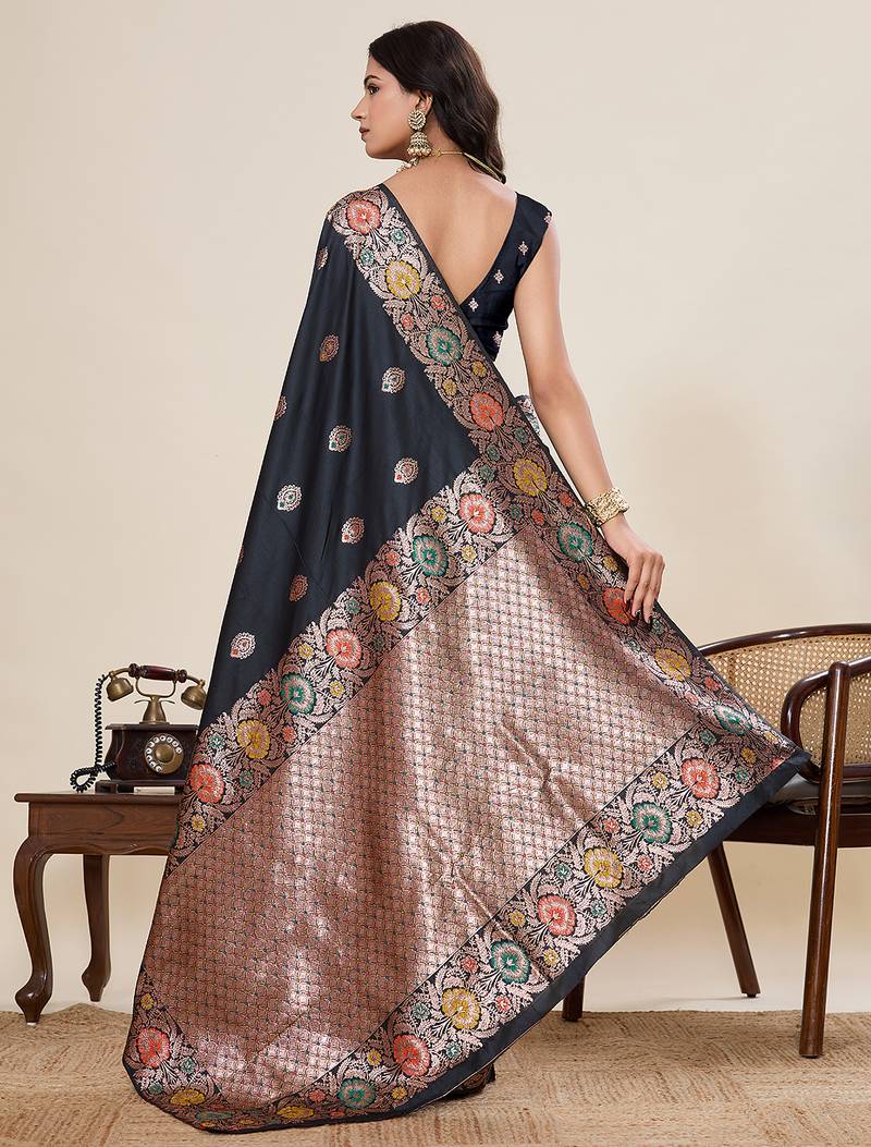 Navy blue floral print woven pure jacquard banarasi saree with blouse