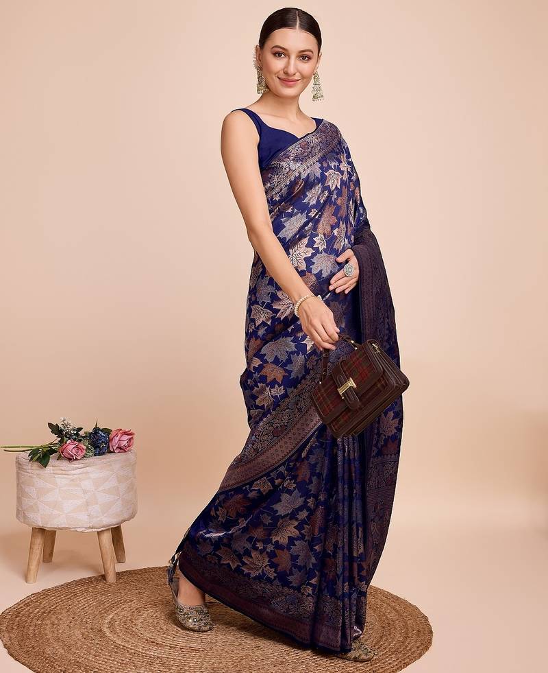 Navy blue woven embellished pure silk banarasi saree with blouse