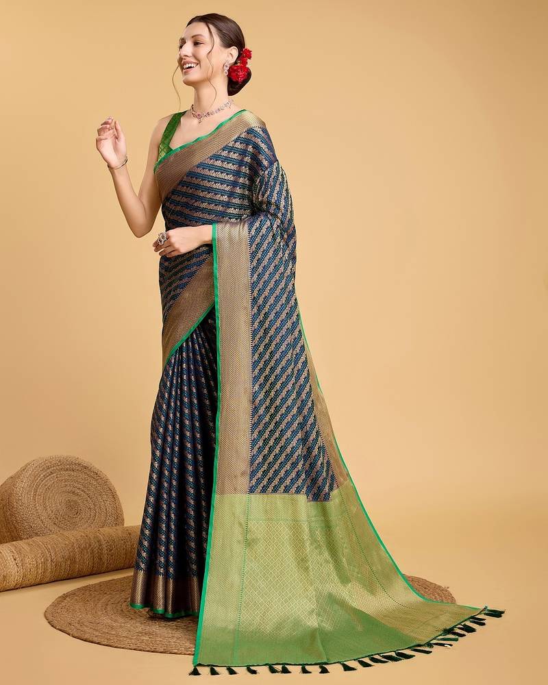 Navy blue woven self design embellished pure silk banarasi saree with blouse