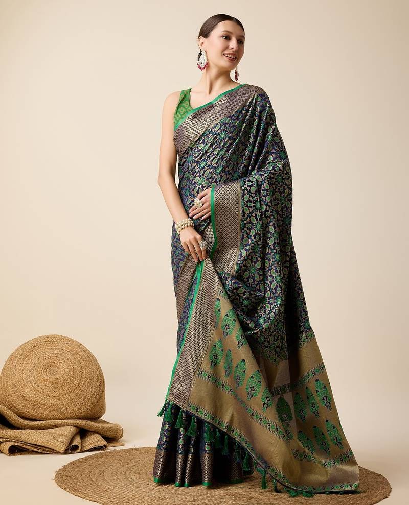 | Product Description | Presenting Banarasi Sarees For Intimate And Big Fat Indian Weddings, That Are Light On Your Skin And Uplift Your Wedding. Fabric : Pure Patola Silk Saree With All Over Contrast Patola Weaved With Contrast Meenakari And Rich Pallu With Tassels Attached |