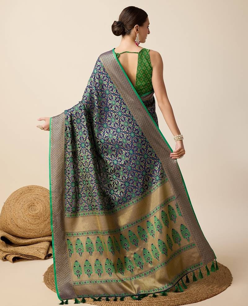 Navy blue woven self design embellished pure silk banarasi saree with blouse