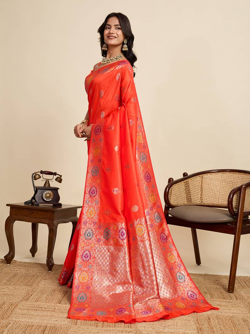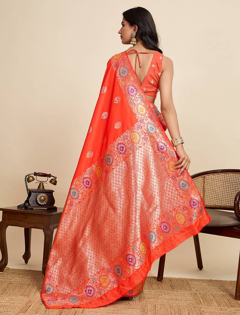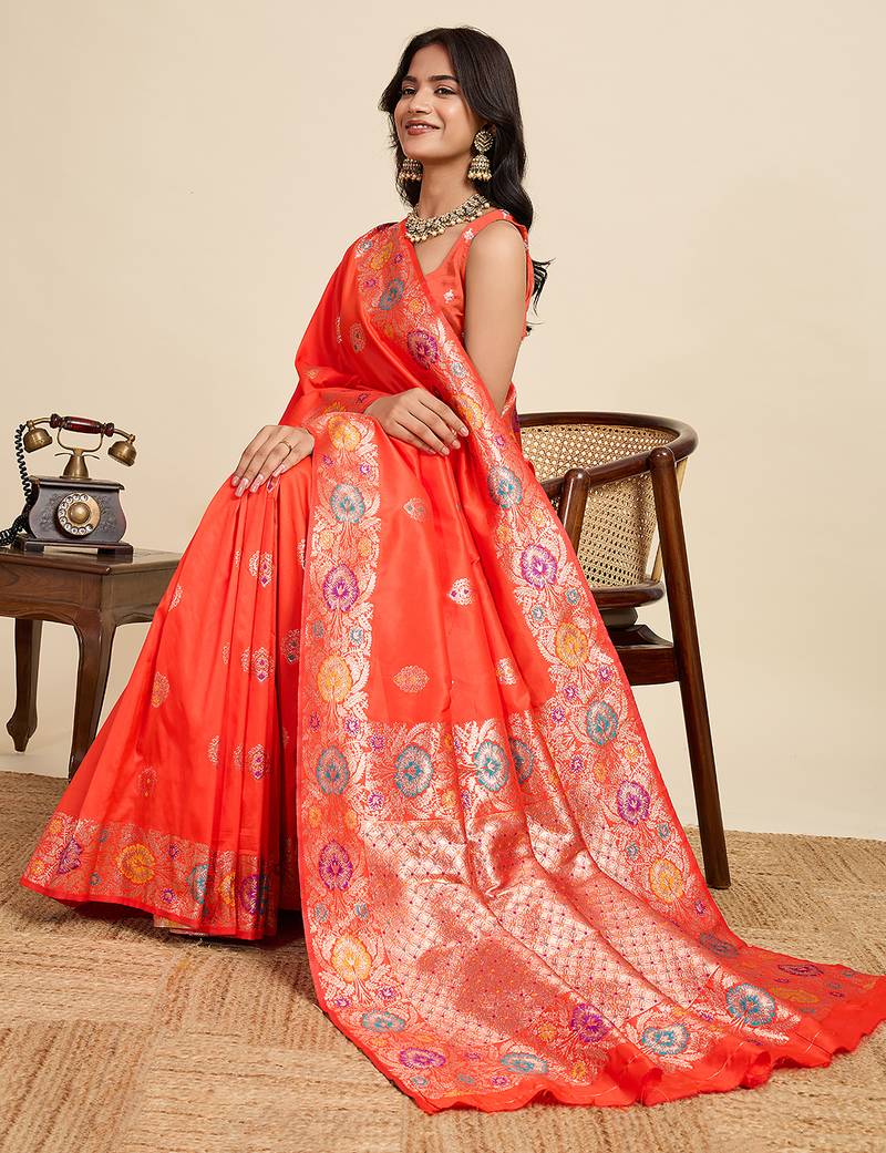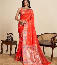Orange floral print woven pure jacquard banarasi saree with blouse