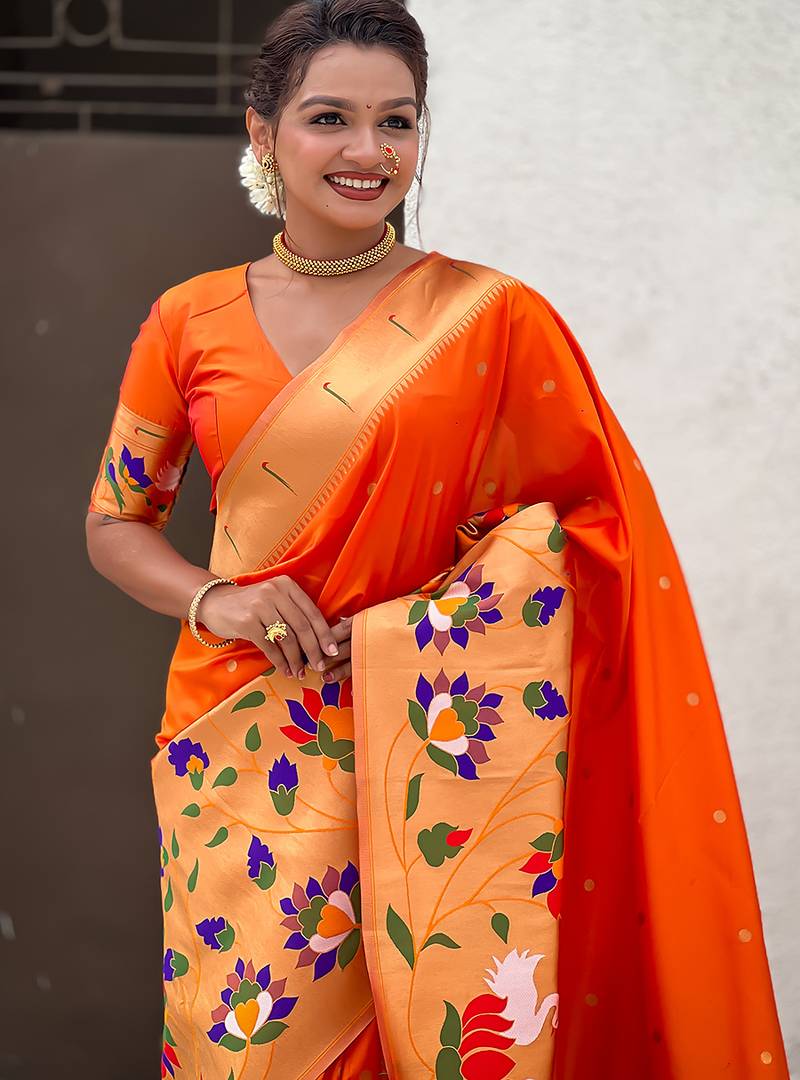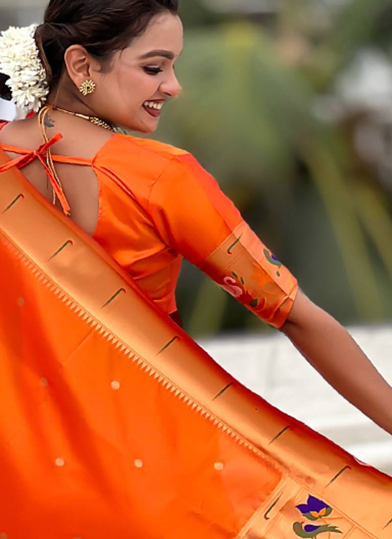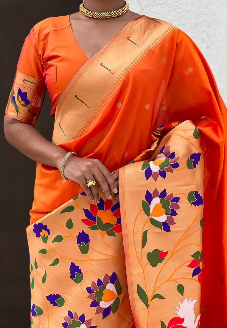 Orange woven self design pure silk paithani saree with blouse