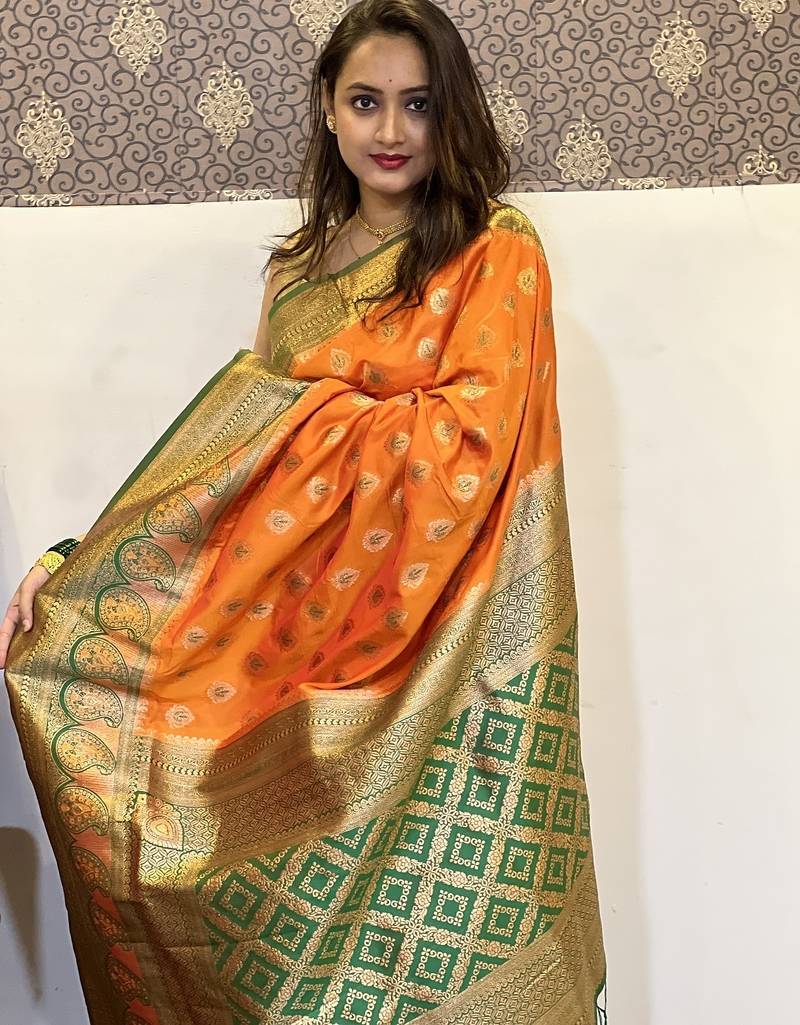 | • | Saree | : | Color- Orange / Fabric- Silk Blend |