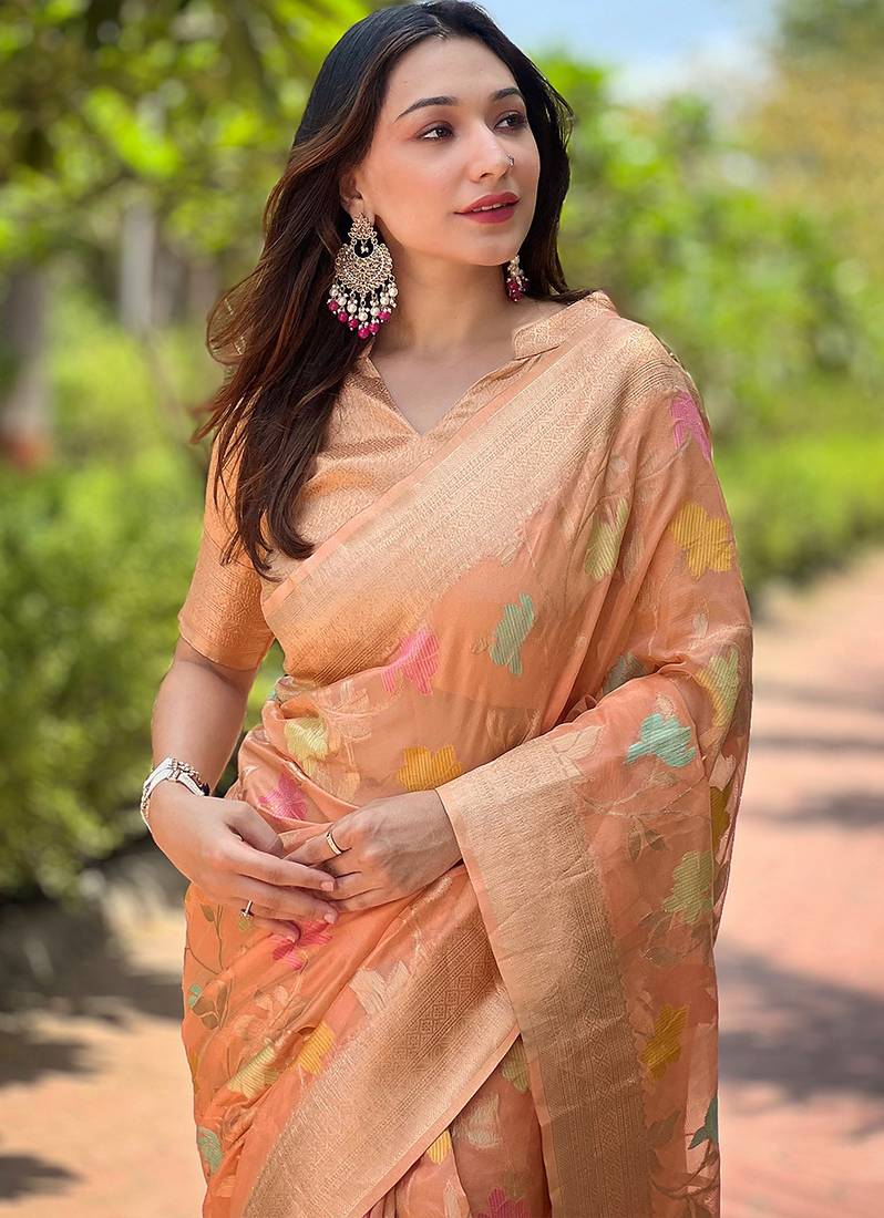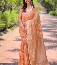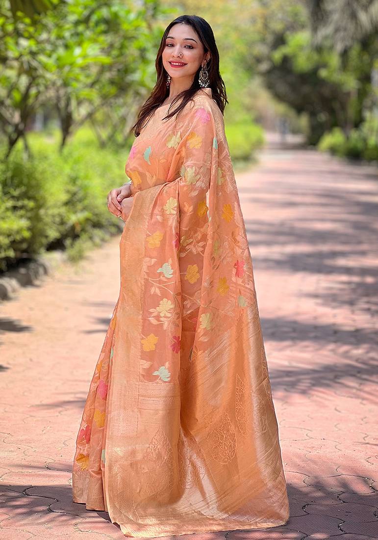 | Product Name | Peach Woven Embellished Organza Kanjivaram Saree With Blouse | |