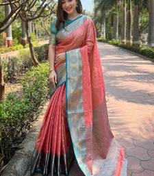 Peach woven self design embellished tissue kanjivaram saree with blouse