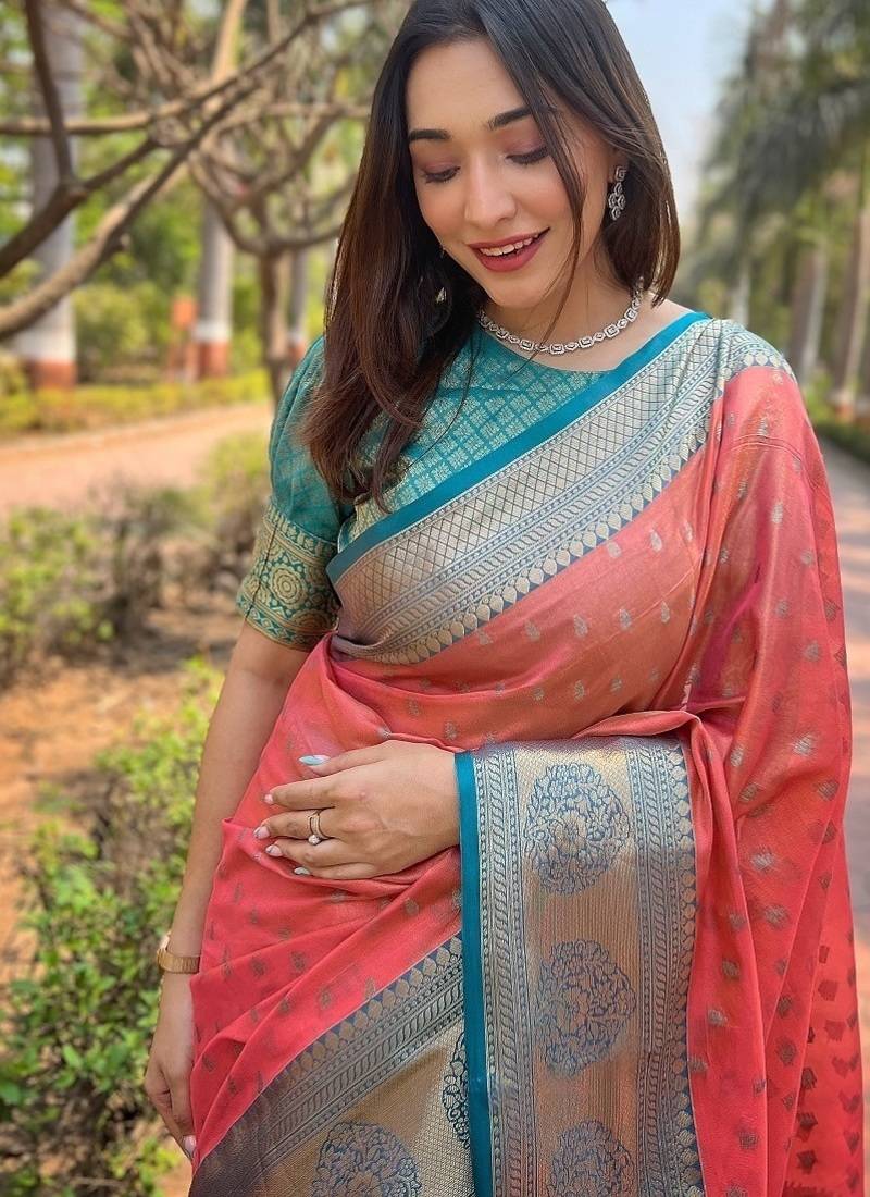 | Product Name | Peach Woven Self Design Embellished Tissue Kanjivaram Saree With Blouse | |