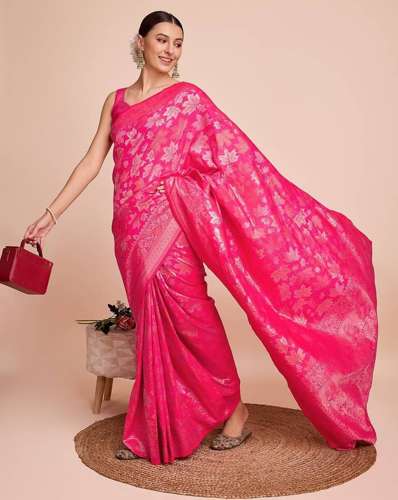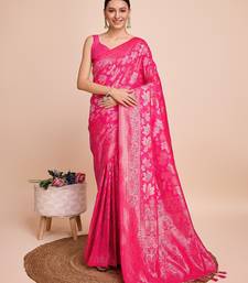 Pink woven embellished pure silk banarasi saree with blouse