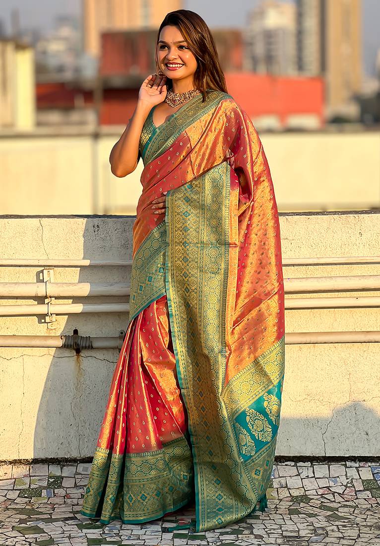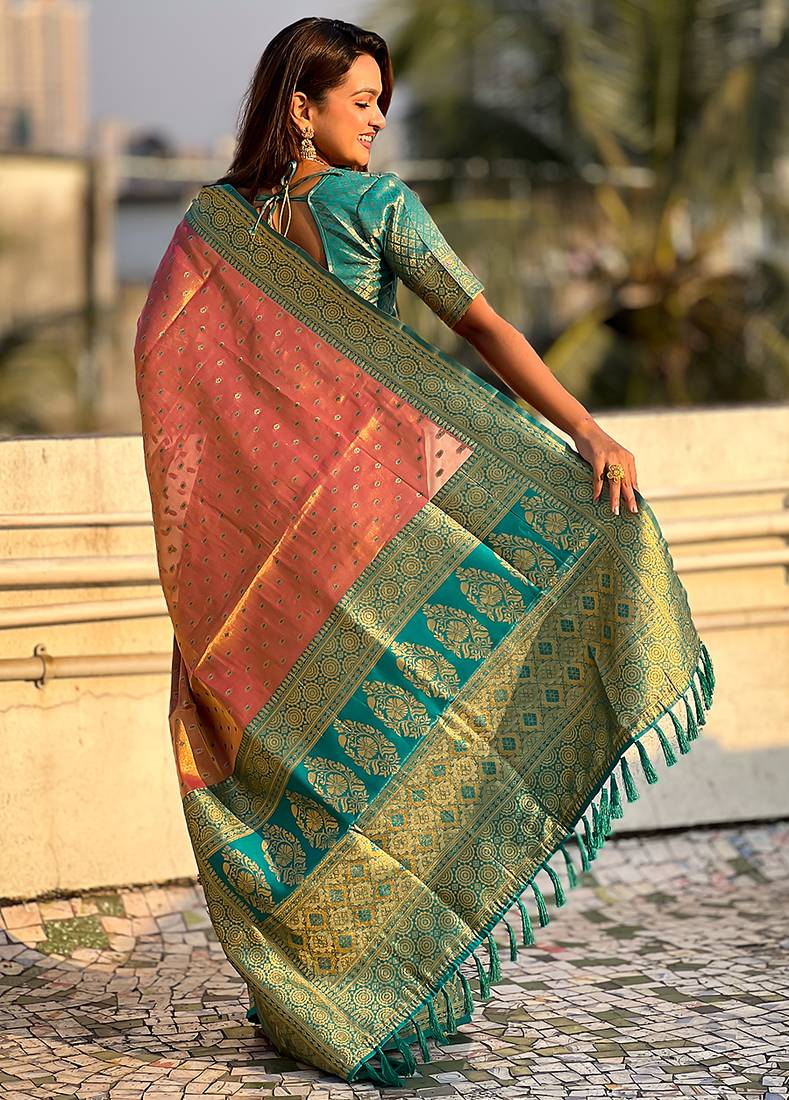 | Product Name | Pink Woven Self Design Embellished Tissue Kanjivaram Saree With Blouse | |