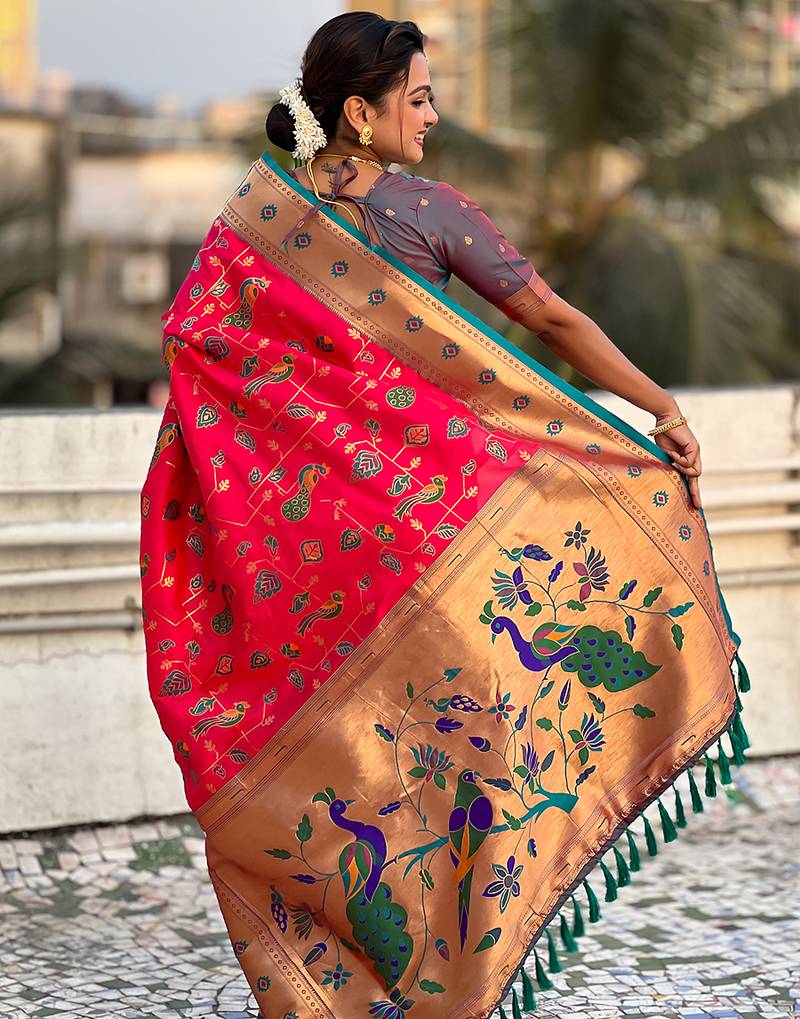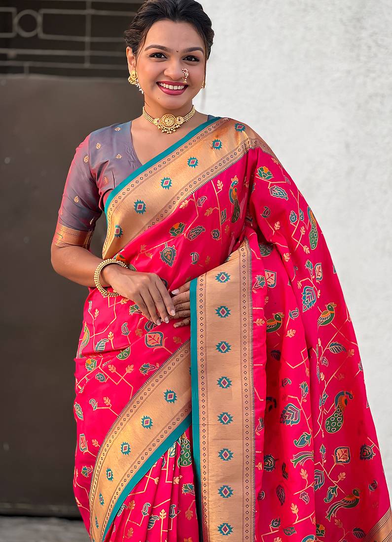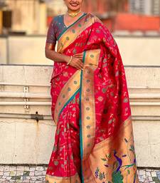 Pink woven self design pure silk paithani saree with blouse