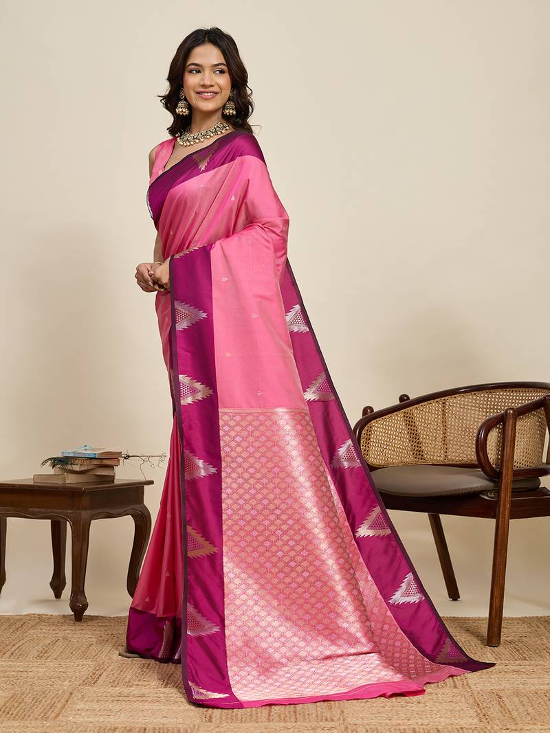 Pink zari woven soft silk banarasi saree with blouse