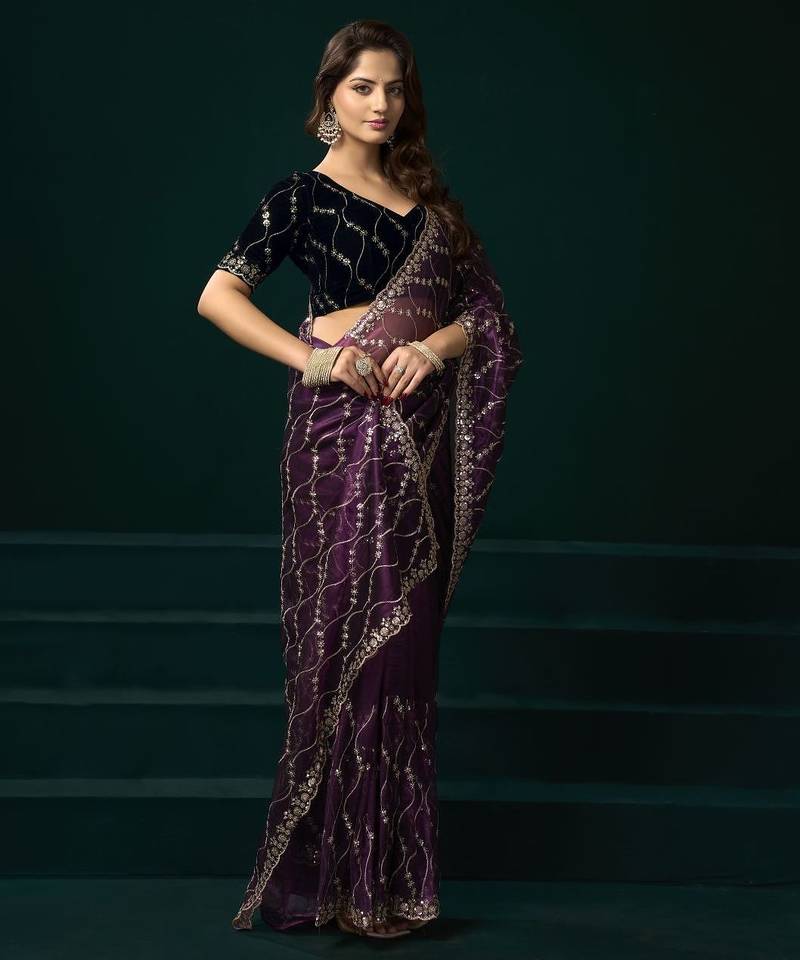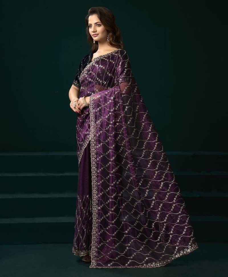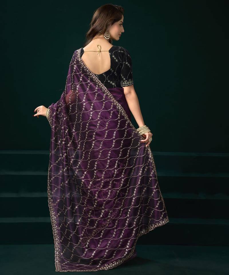 Purple embroidered embellished bollywood net saree with blouse