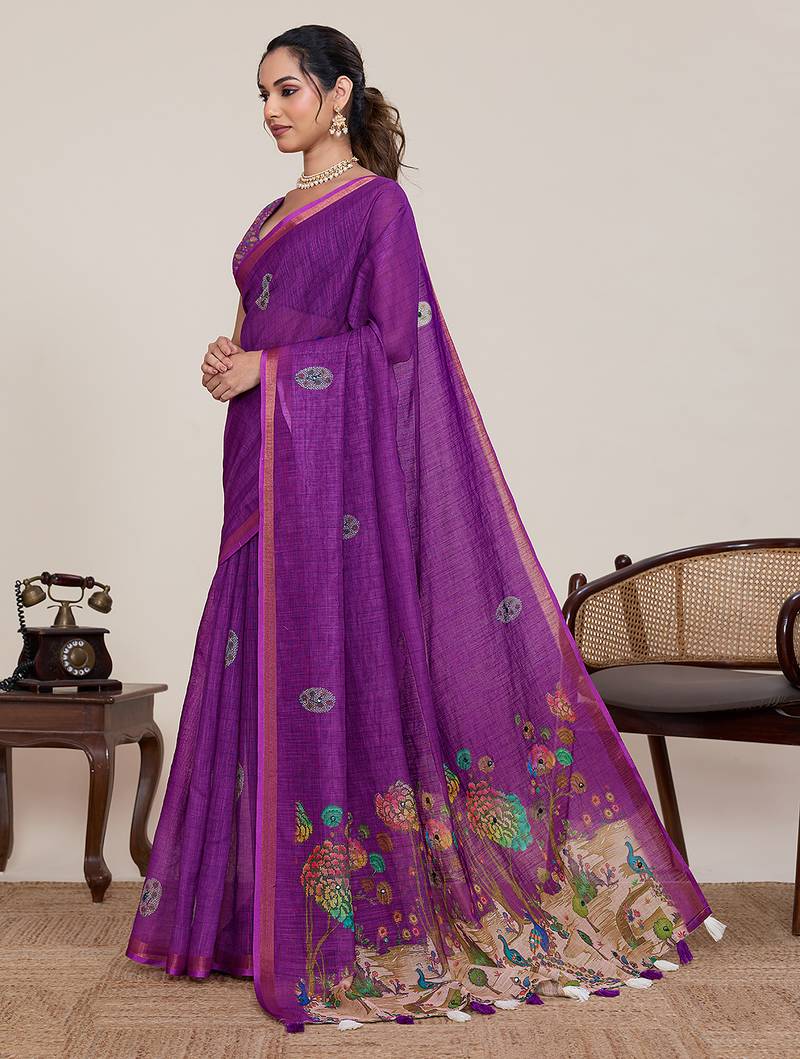 Purple printed linan bollywood saree with blouse