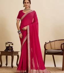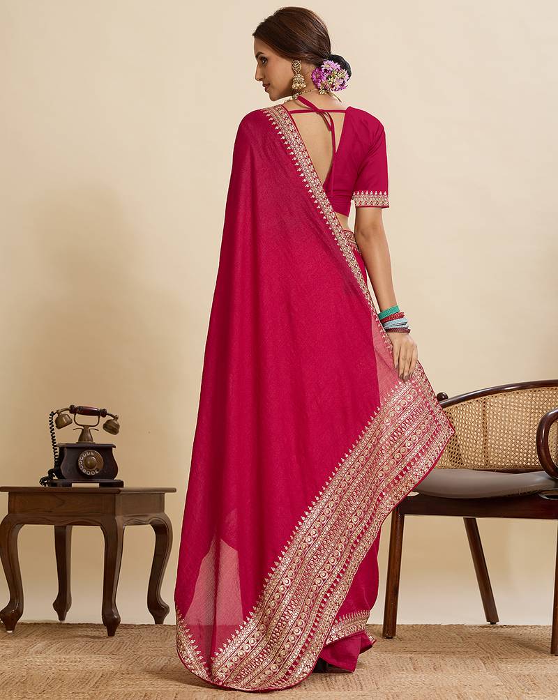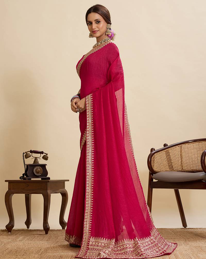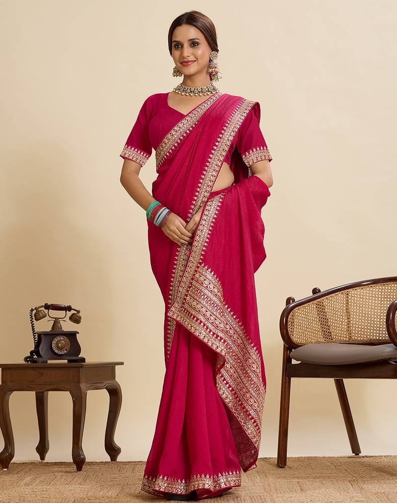 Rani pink embroidered vichitra soft silk bollywood saree with blouse