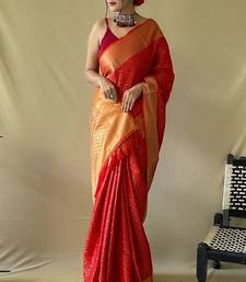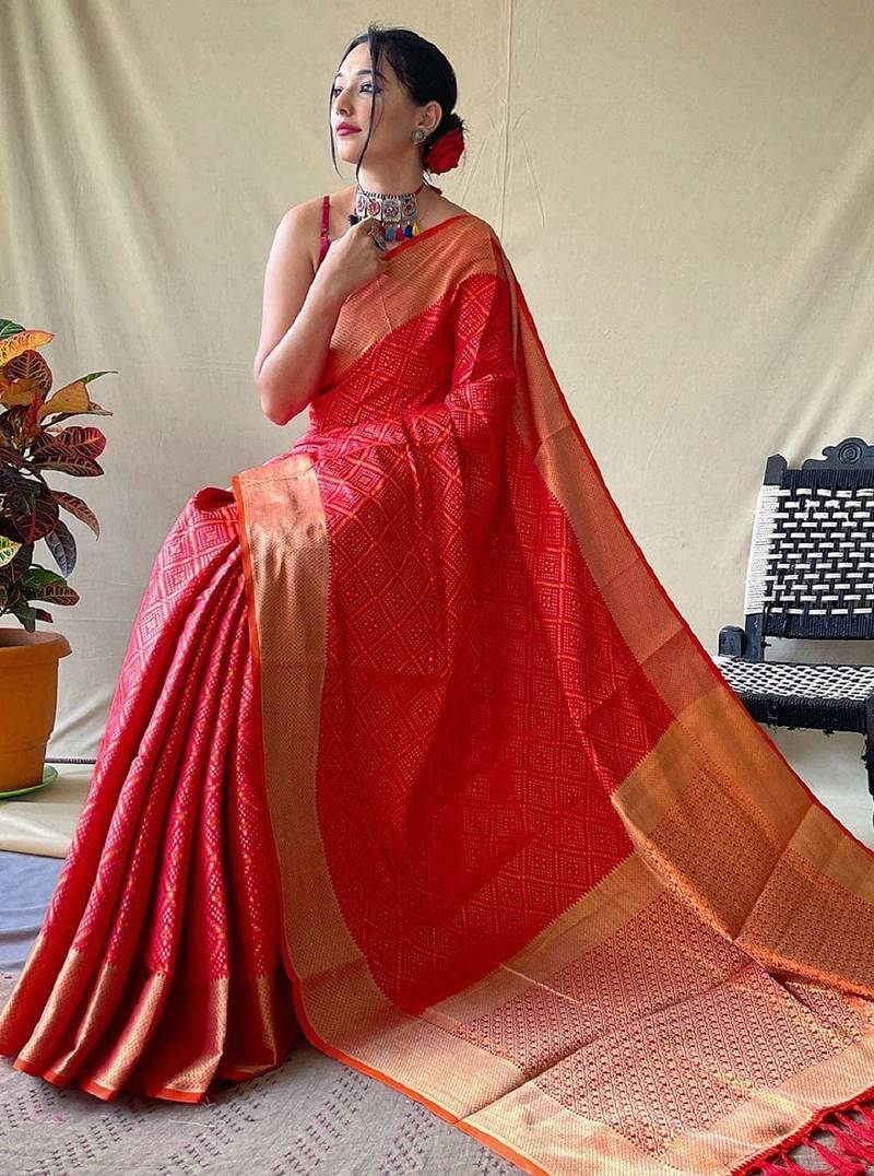 Red woven self design embellished pure silk patola saree with blouse