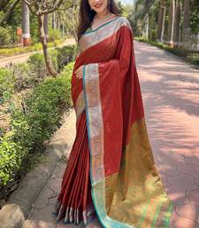 Red woven self design pashmina silk saree with blouse