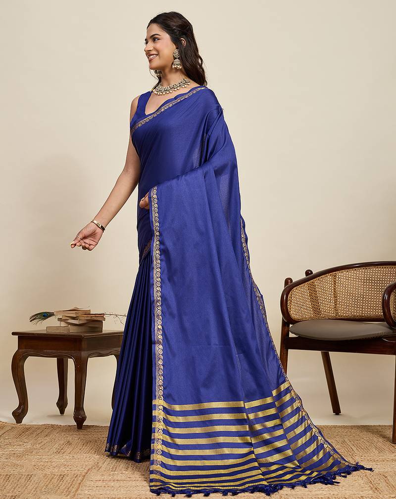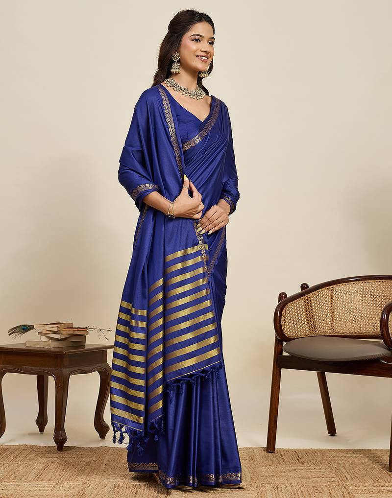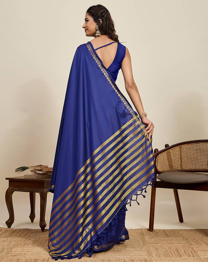 Royal blue striped, solid soft silk banarasi saree with blouse