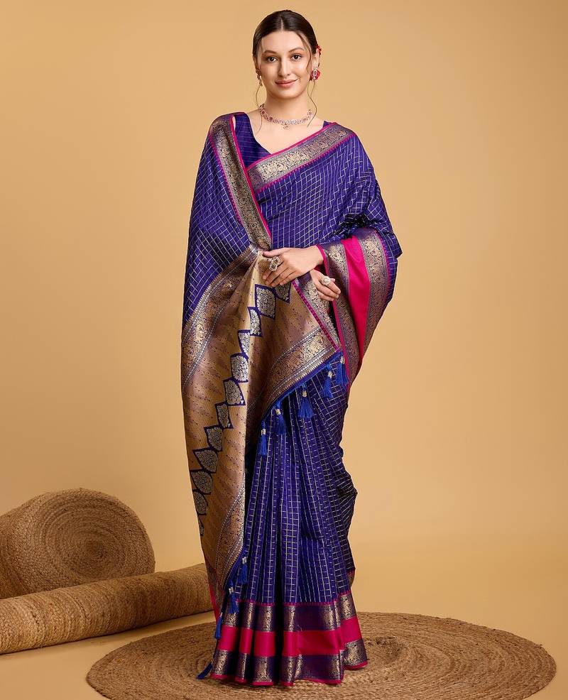 Royal blue woven checkered pure silk banarasi saree with blouse