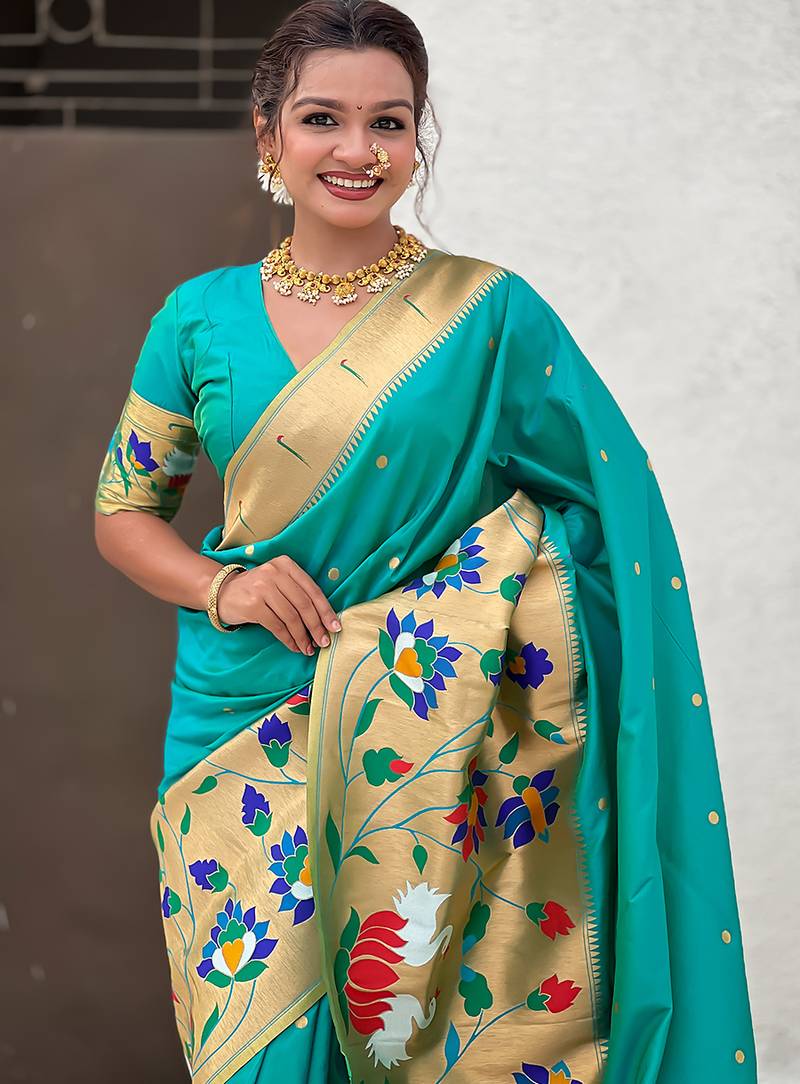 | Product Description | Paithani Silk Saree With Gold Zari Polka Motifs All Over The Body Having Rich Woven Meenakari Paithani Meenakari Designer Pallu, Half Half Paithani Unique Border And Paired With Running Blouse Same As Shown. |