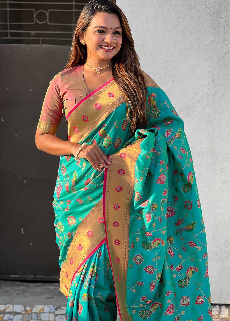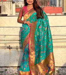 Sea green woven self design pure silk paithani saree with blouse