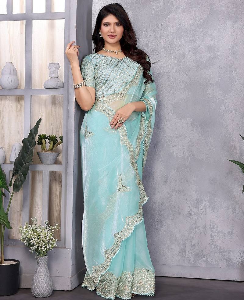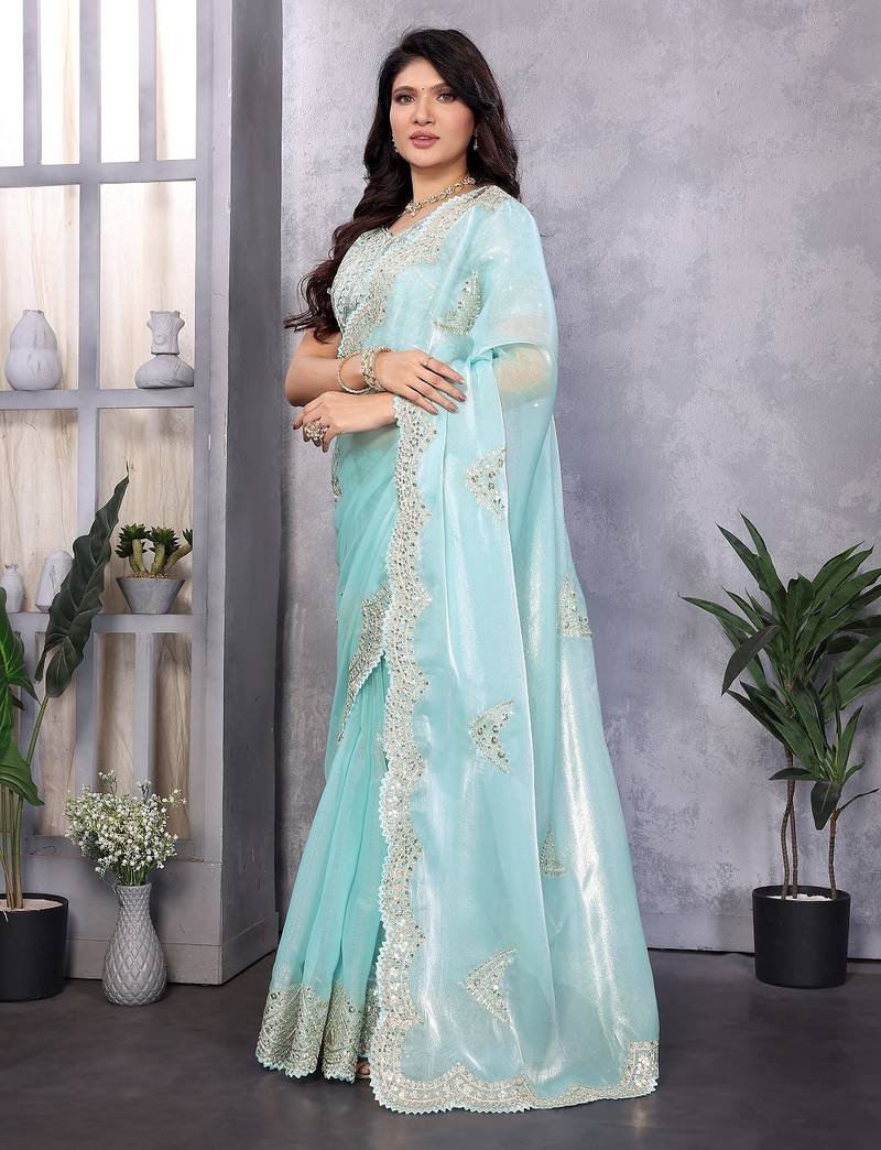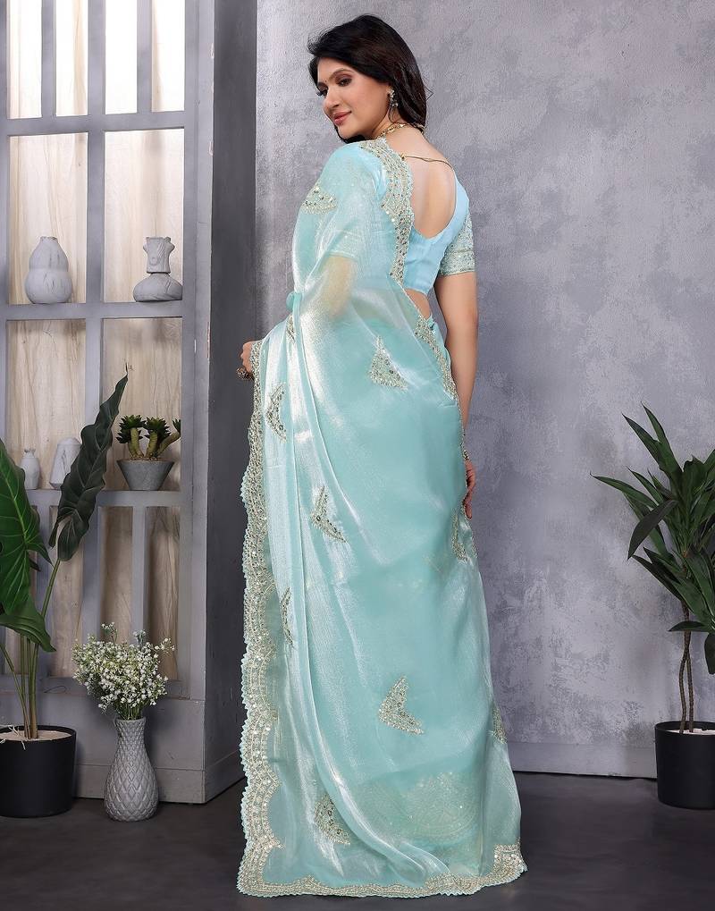 Sky blue embroidered embellished shimmer chiffon bollywood saree with blouse