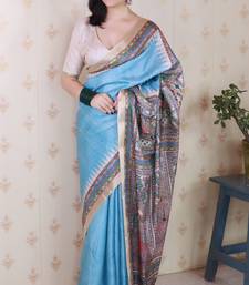 Sky blue printed tussar silk printed saree with blouse