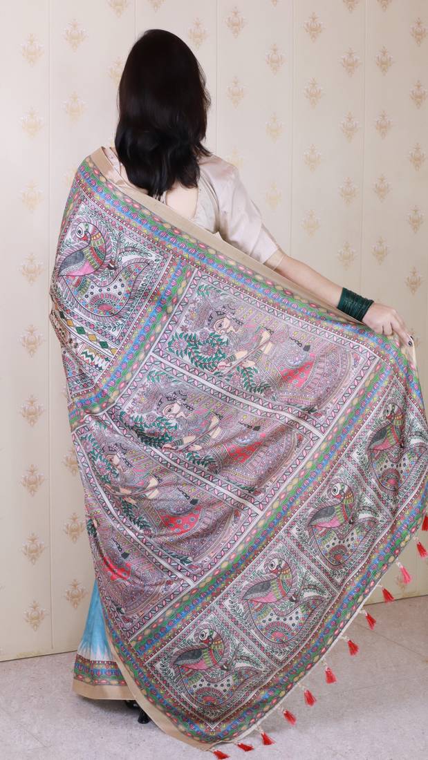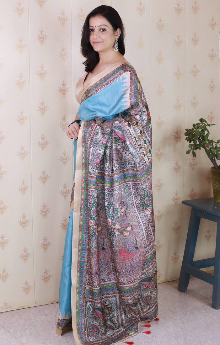 | Product Description | Tussar Silk Sarees Having Zari Woven 3 Inch Border On Both Sides Rich Madhubani Digitally Printed Pallu. Paired With Running Printed Blouse. |