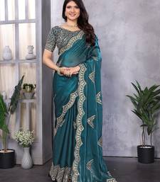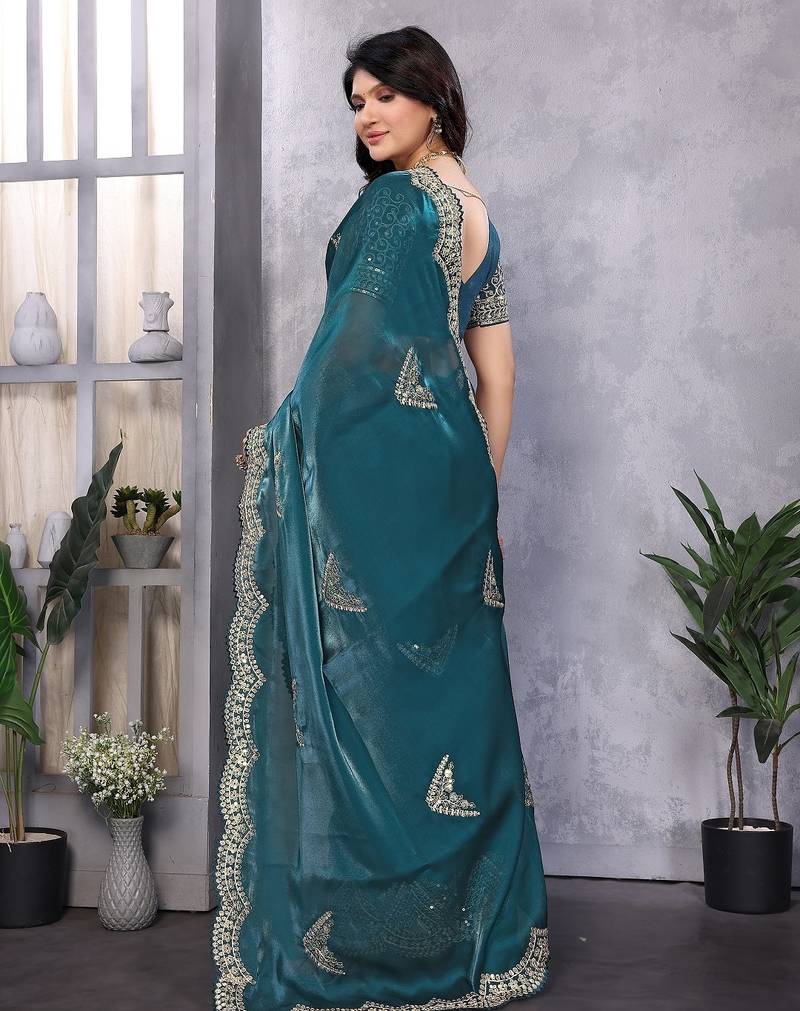 Teal blue embroidered embellished shimmer chiffon bollywood saree with blouse