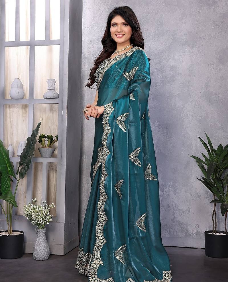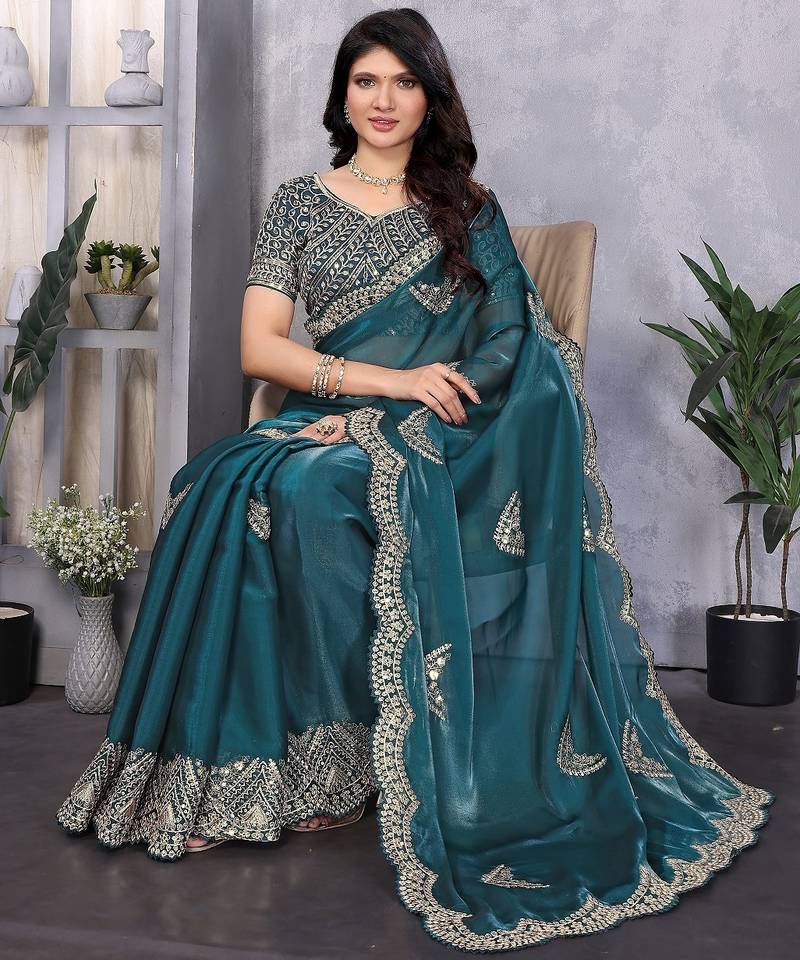 | Product Name | Teal Blue Embroidered Embellished Shimmer Chiffon Bollywood Saree With Blouse | |