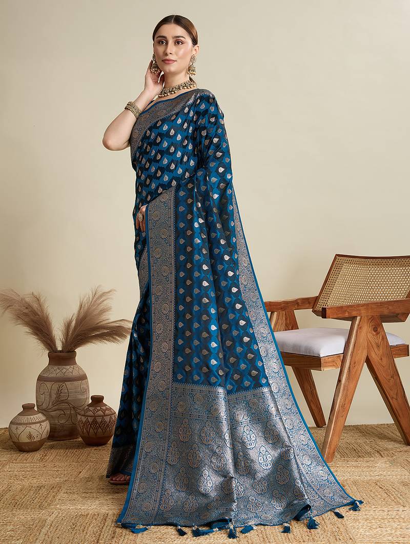 Teal blue woven embellished self design satin silk blend banarasi saree with blouse