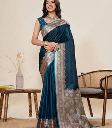 Teal blue woven pure satin silk banarasi saree with blouse
