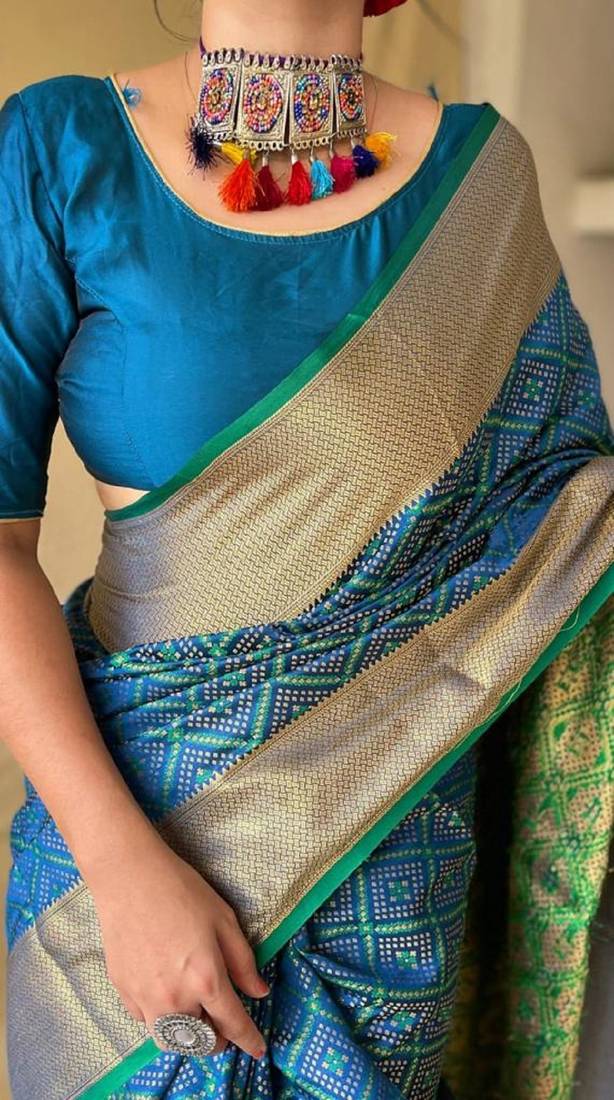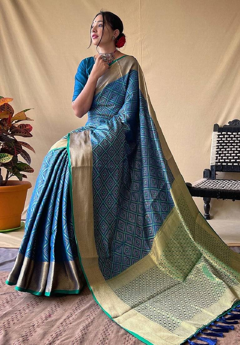 | Product Name | Teal Blue Woven Self Design Embellished Pure Silk Patola Saree With Blouse | |