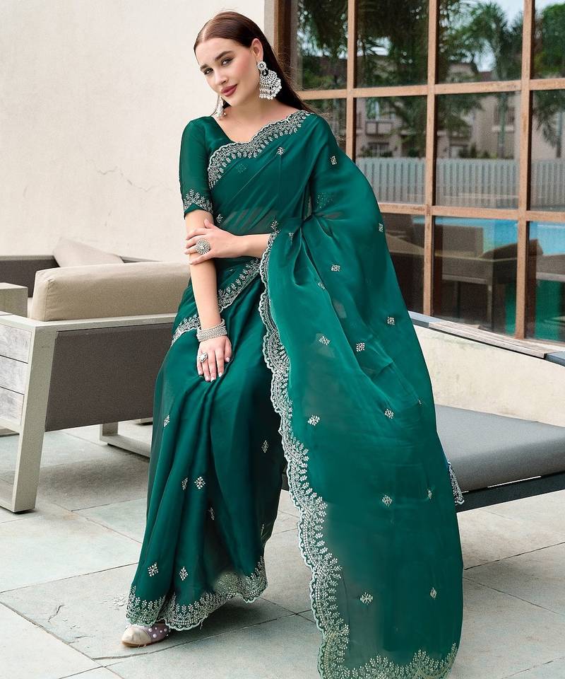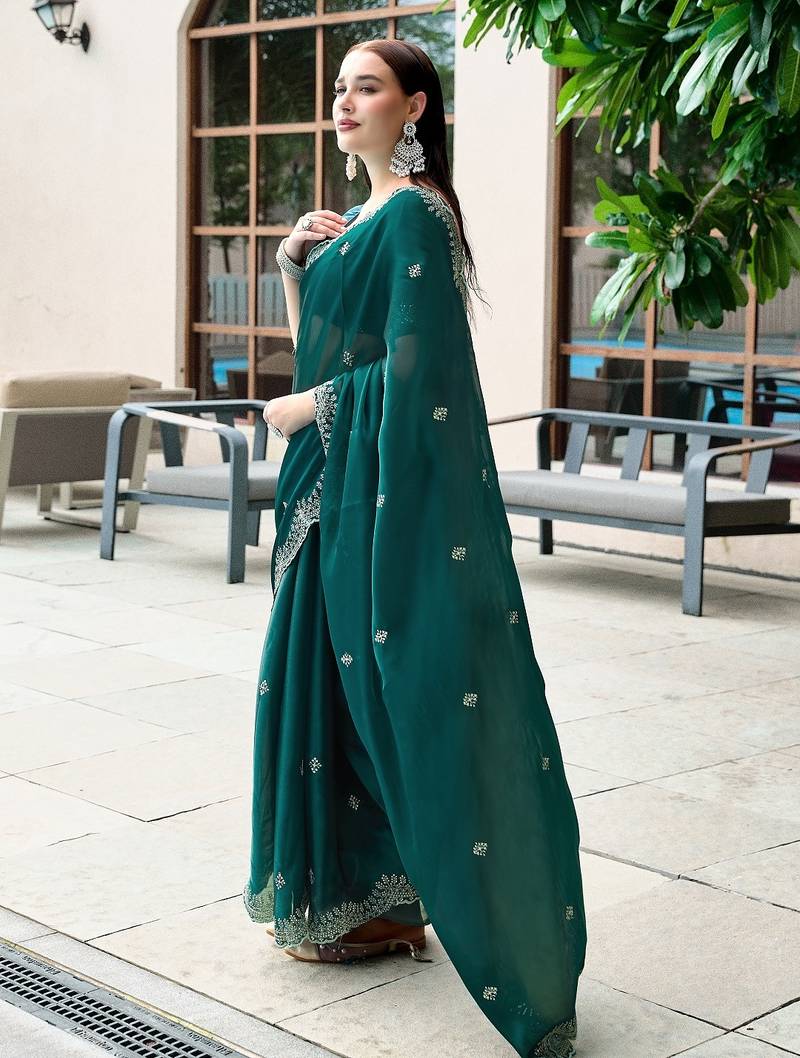 Teal green embroidered embellished shimmer chiffon bollywood saree with blouse