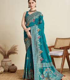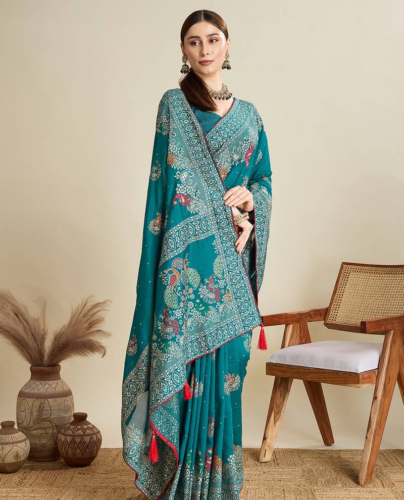 Teal green printed floral print cotton silk bollywood saree with blouse