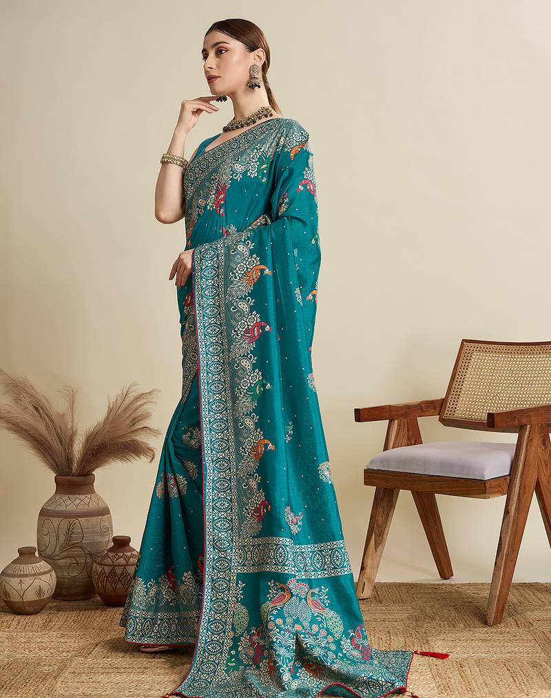Product Name Teal Green Printed Floral Print Cotton Silk Bollywood Saree With Blouse