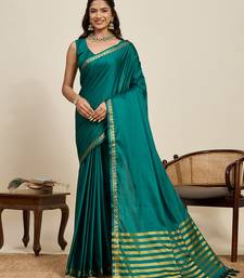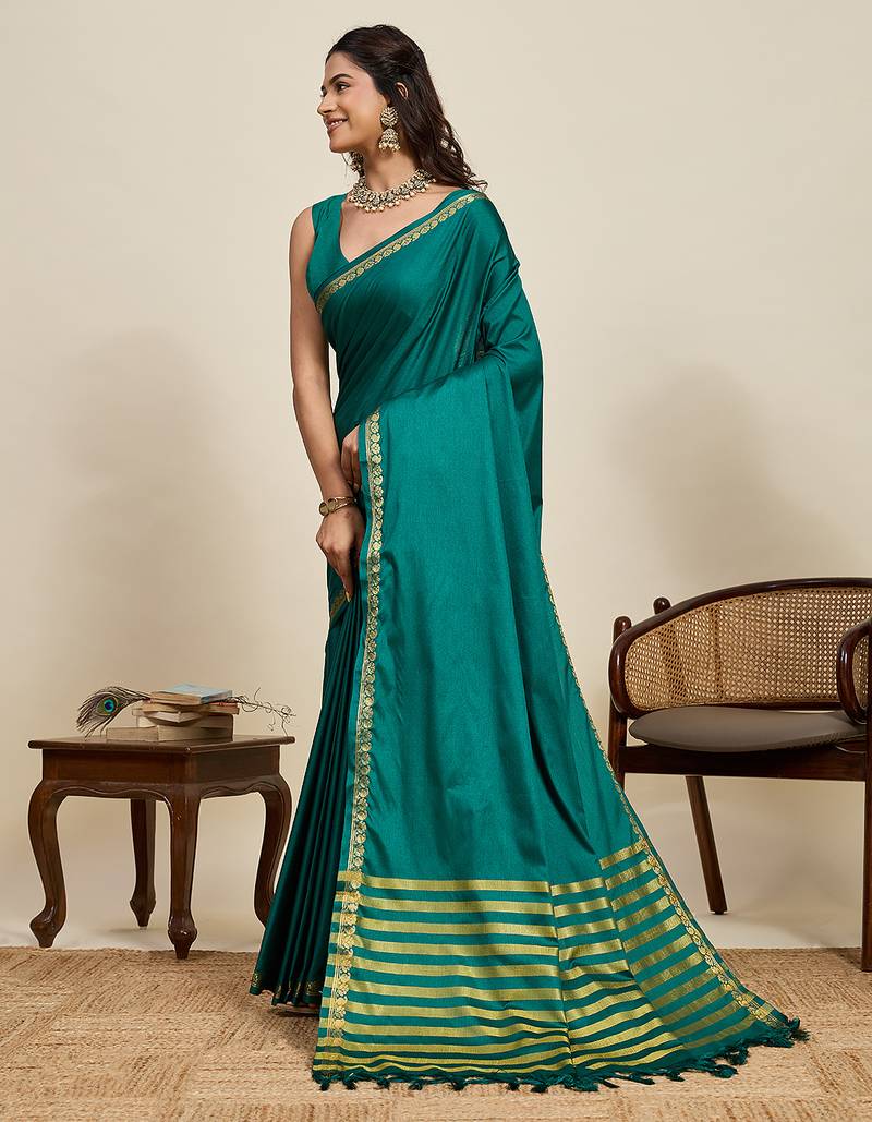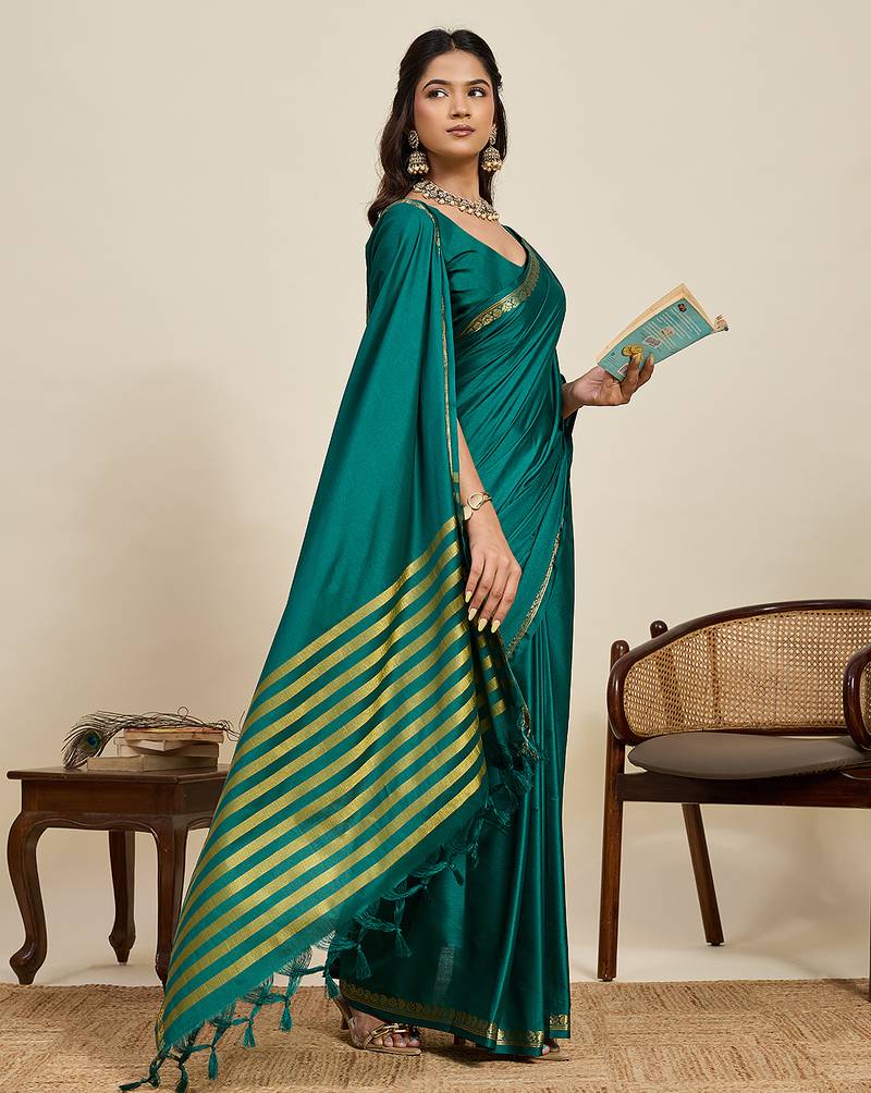 Teal green striped, solid soft silk banarasi saree with blouse