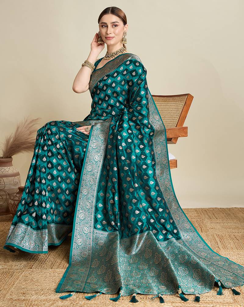 Teal green woven embellished self design satin silk blend banarasi saree with blouse
