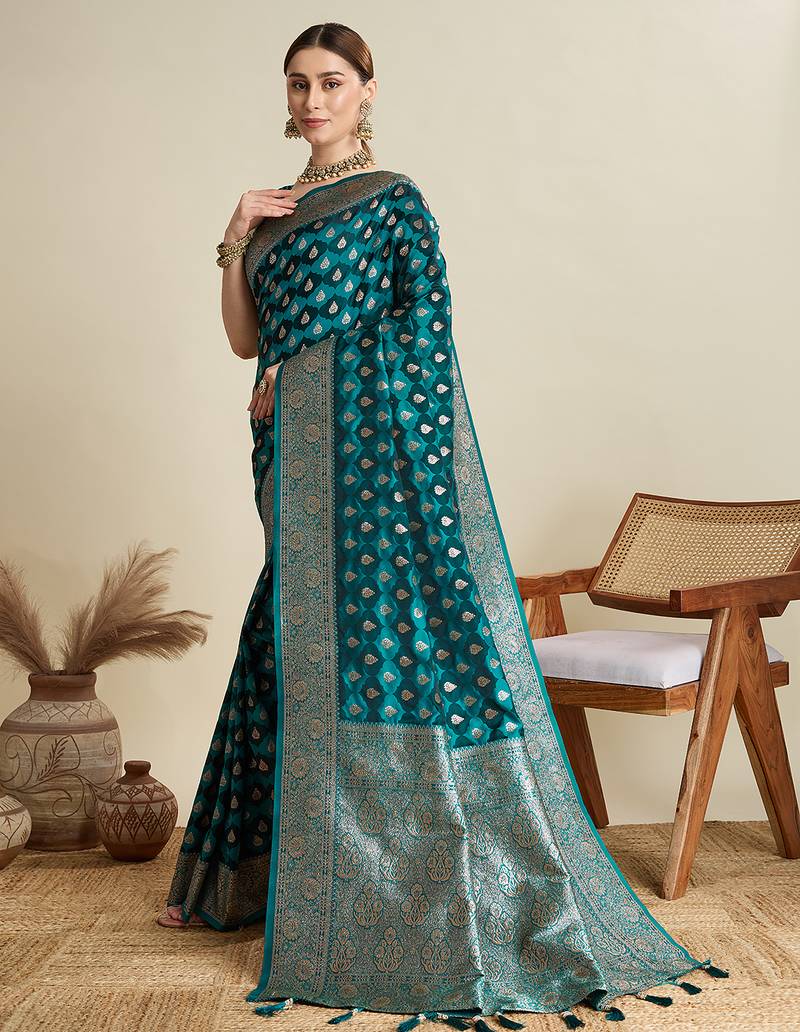 | Product Name | Teal Green Woven Embellished Self Design Satin Silk Blend Banarasi Saree With Blouse | |