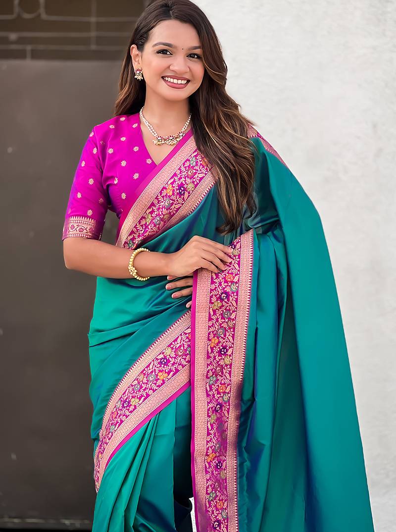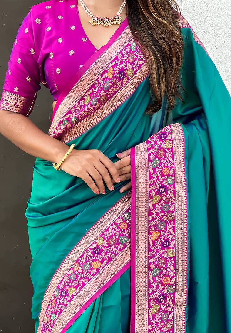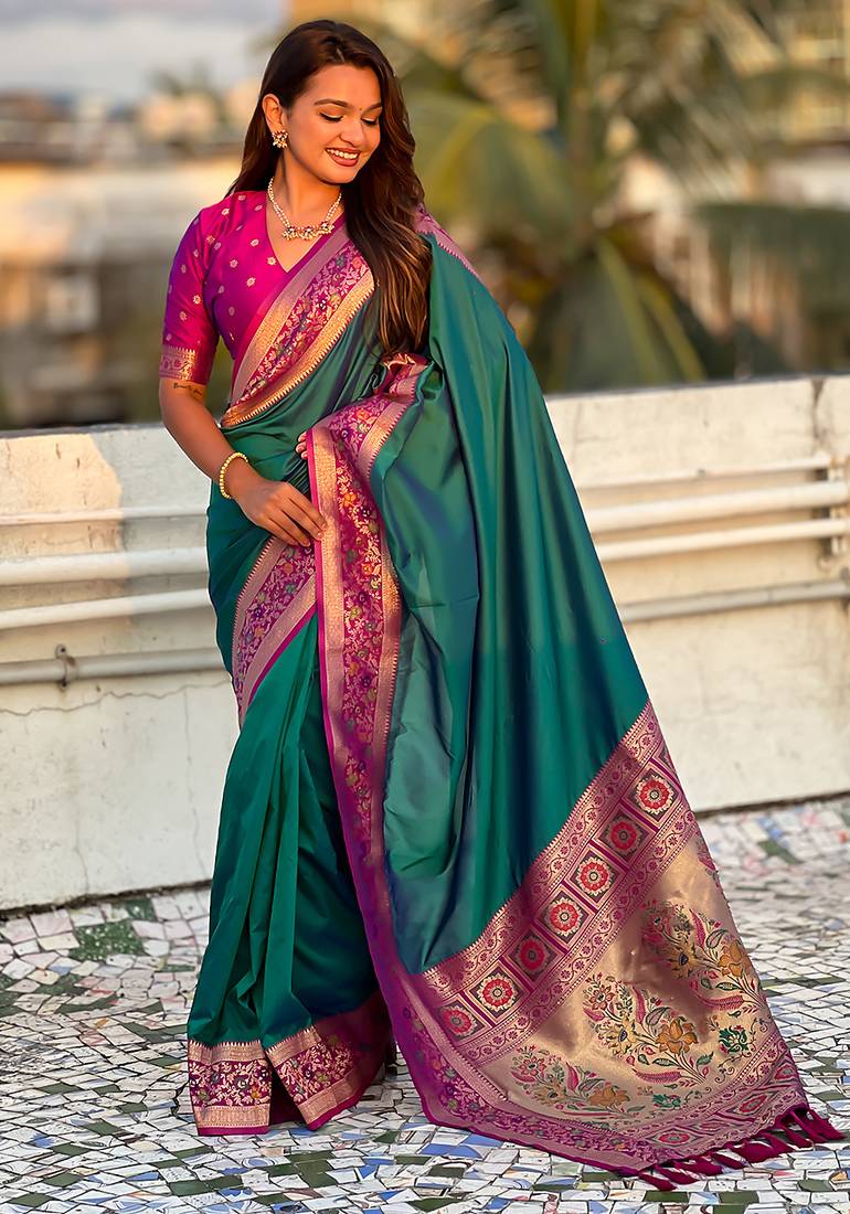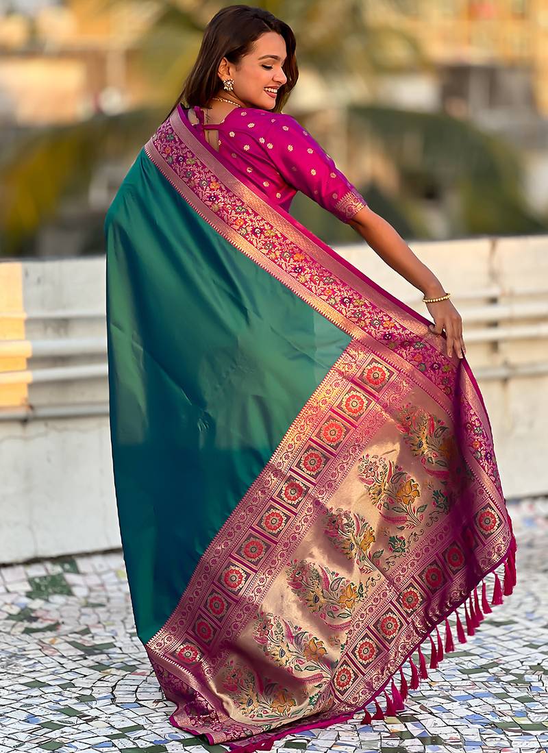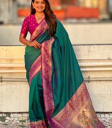 Teal green woven self design pure silk paithani saree with blouse