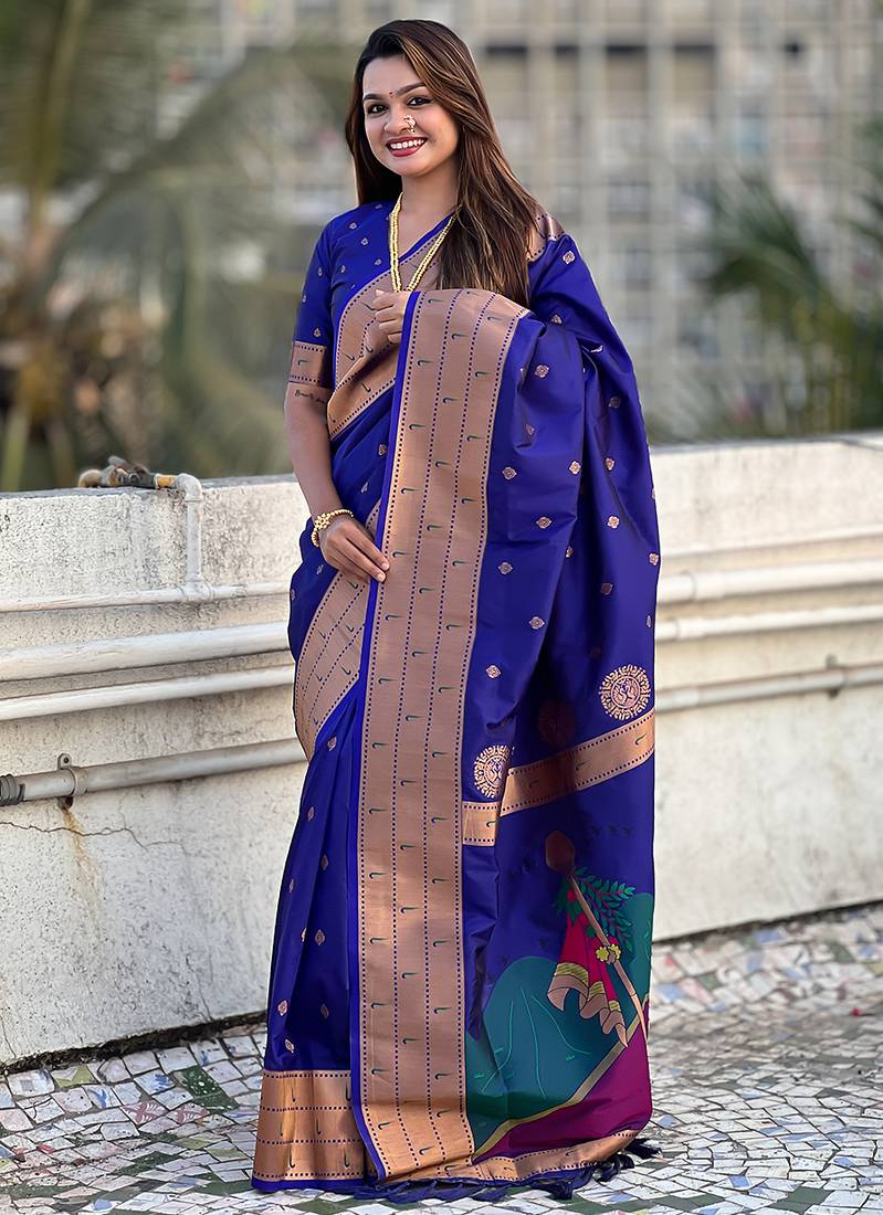 | Product Description | Soft Silk Sarees With Floral Motifs Weaves All Over The Body Having Rich Woven Paithani Gudi Padwa Figure Pallu And Triple Muniya Paithani Border Paired With Brocade Blouse Same As Shown |