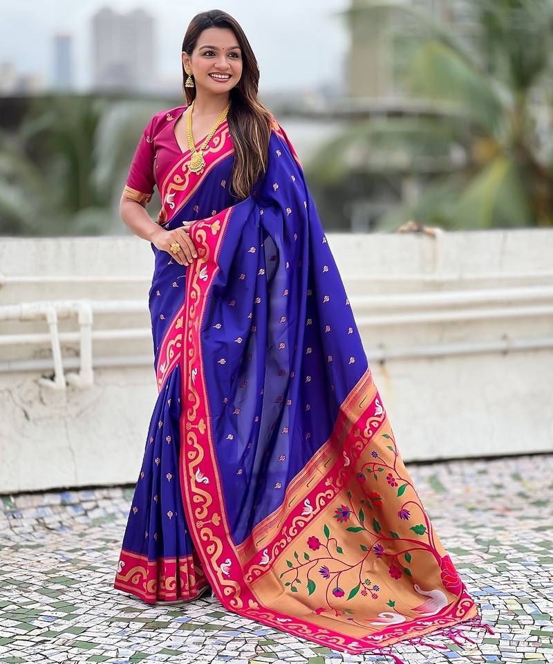 Violet woven self design pure silk paithani saree with blouse